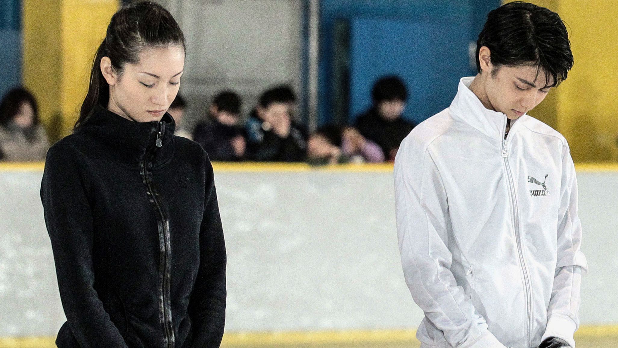 Shizuka Arakawa and Yuzuru Hanyu observe a moment of silence for victims of the Tohoku earthquake at the Ice Rink Sendai in his home city on March 11, 2012, exactly a year after the natural disaster. (Photo by Kyodo)