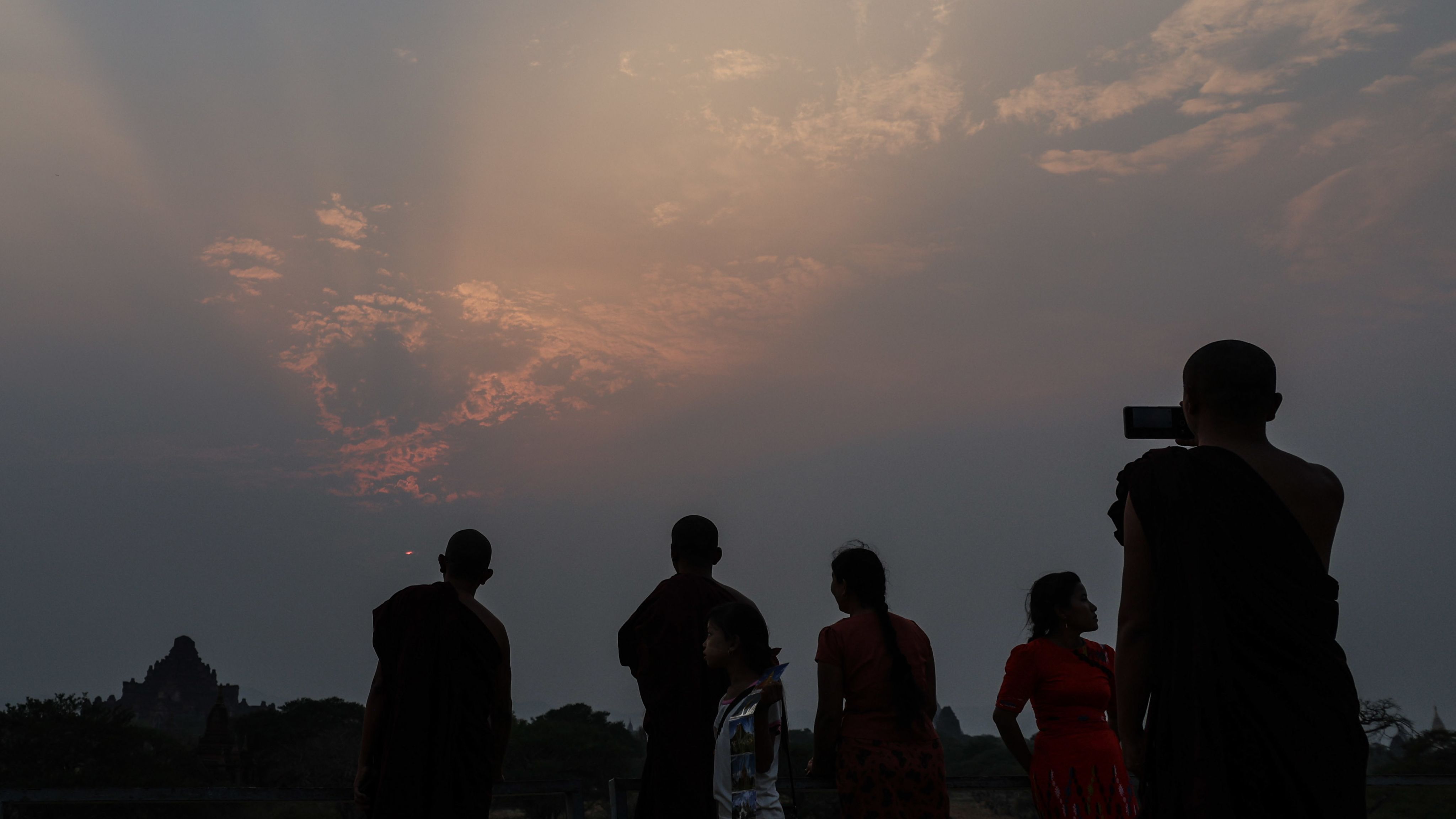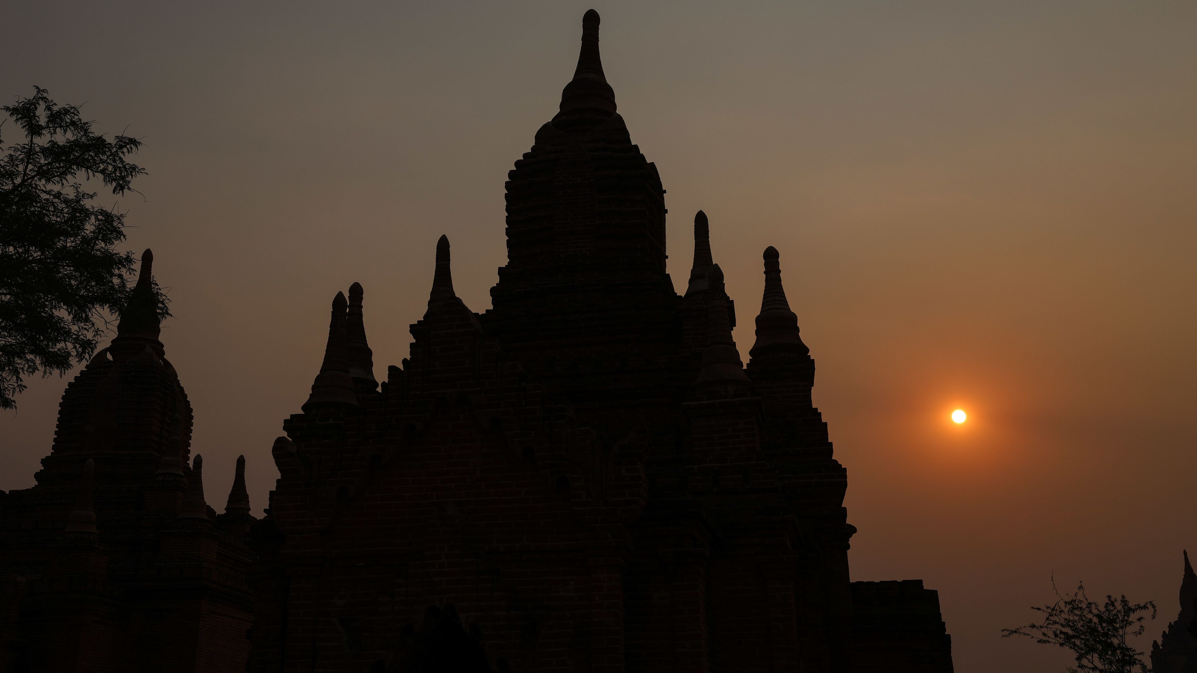 The sun silhouettes a temple in Bagan as it sets on March 31.