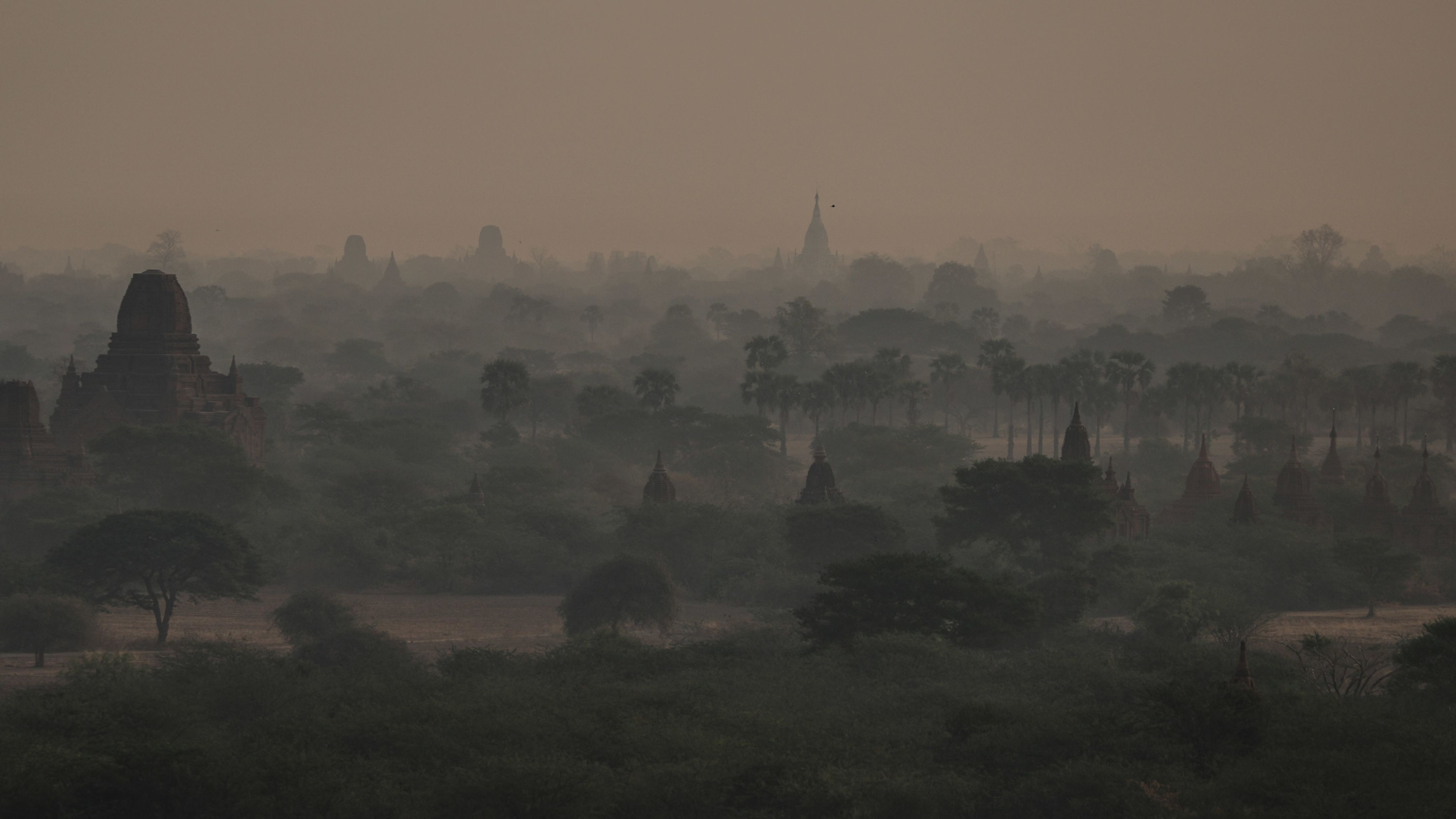 The ancient pagodas of Bagan rise above the mist on April 1.