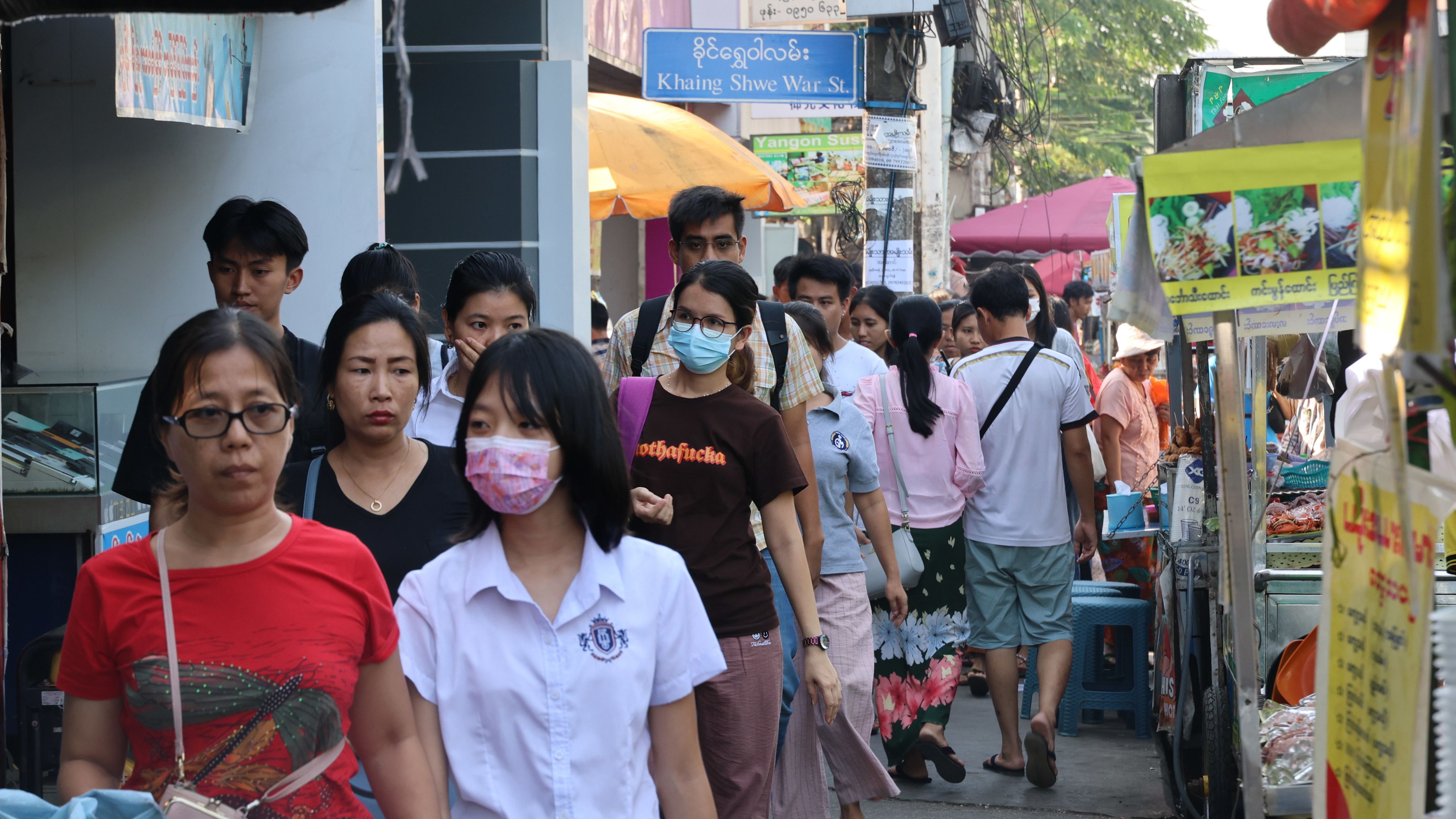 Myanmar people walk around the Hledan shopping district of Yangon on March 29.