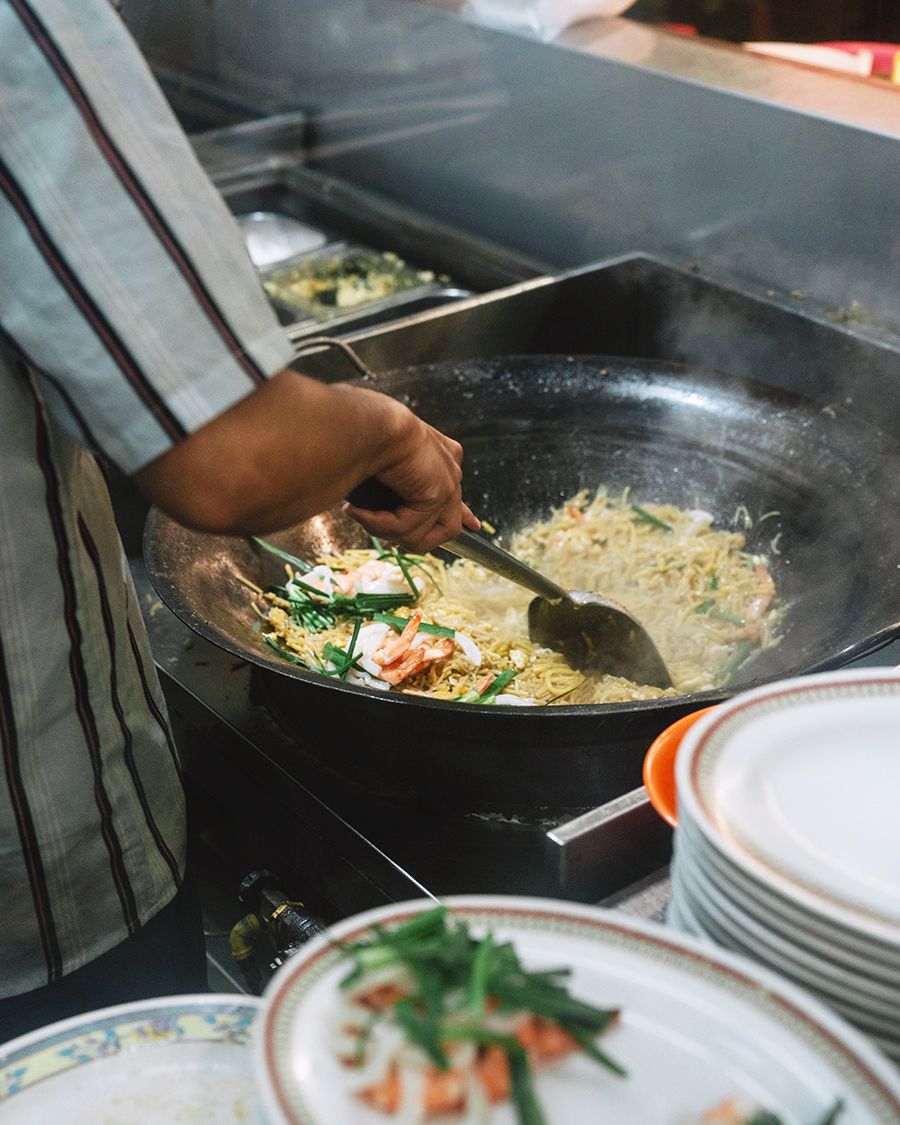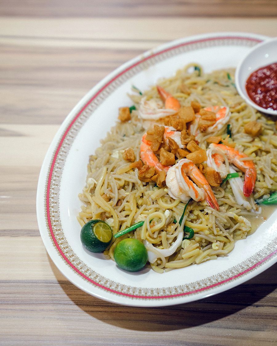 Above this supper spot, there used to be a neon sign for “Rolex Mee Master Tan Kue Kim.” Mee is a term that locals use to refer to noodles, and Master Tan, the late patron of Kim’s Famous Fried Hokkien Prawn Mee, was often seen at night frying up wok-fried delights for his customers. Tan, who died this year, was known for dishing plate after plate of fried noodles in the Chinese Hokkien style. His capable assistants have since taken over the kitchen.