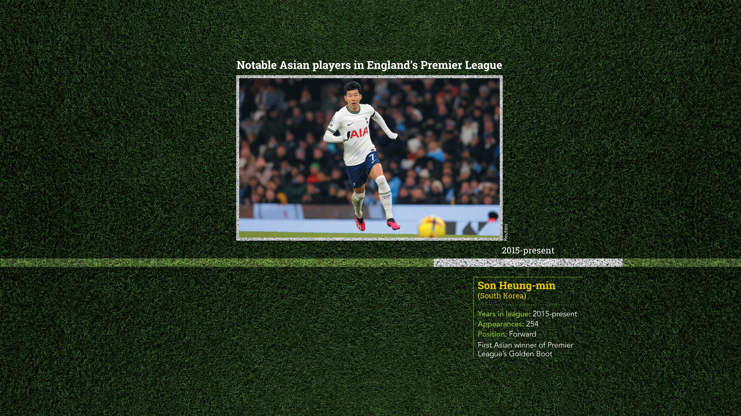 "I'm not sure if we will see another Asian player like him in the coming 100 years," said Shin Moon-sun, a football commentator and sports data professor at South Korea's Myongji University. He said Son's skills at controlling the ball while sprinting have helped him to stand out in the Premier League, as has his ability to shoot from the right and left.