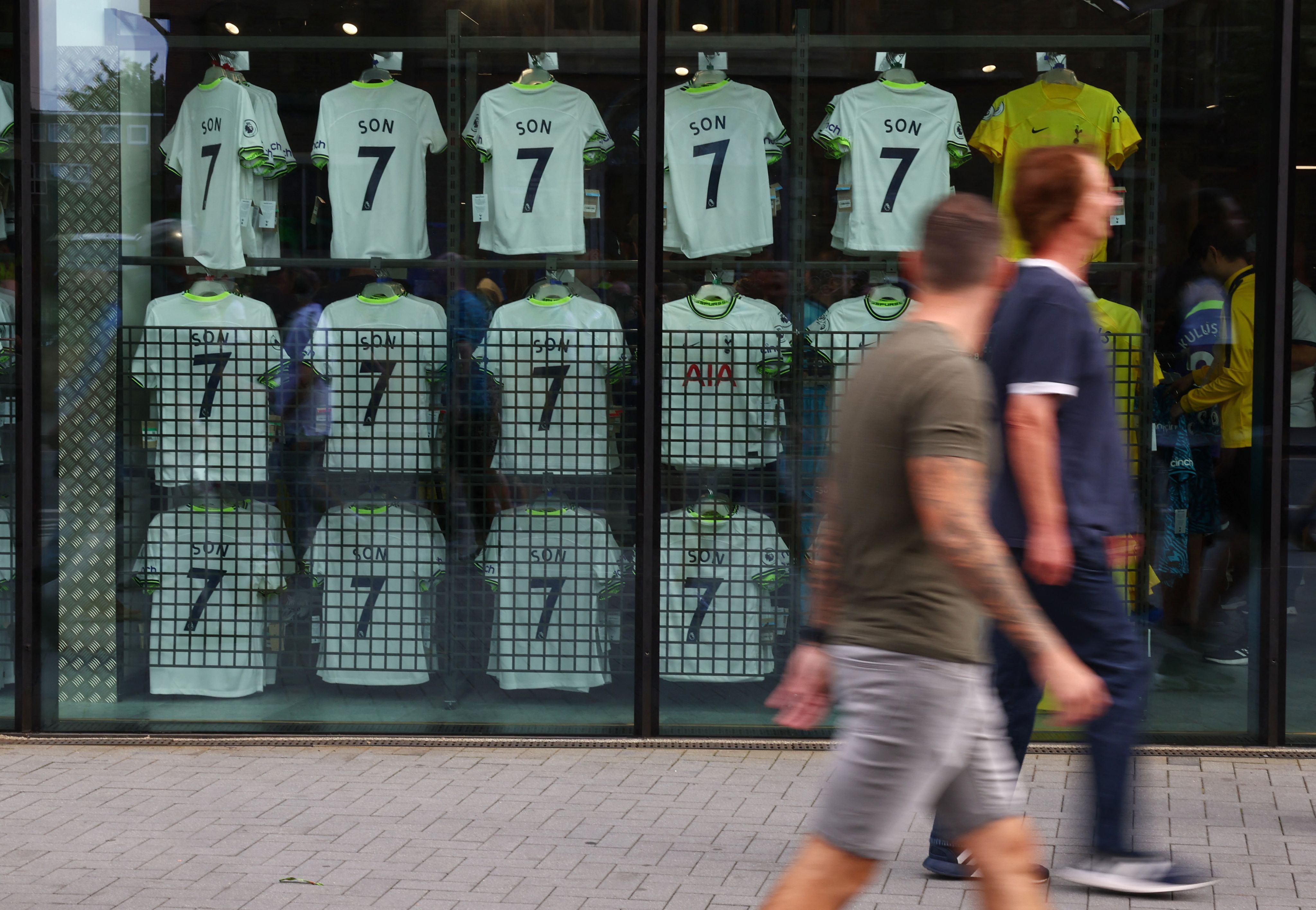Rails of Son Heung-min T-shirts are seen for sale outside Tottenham Hotspur Stadium in Sept. 2022. (© Reuters)