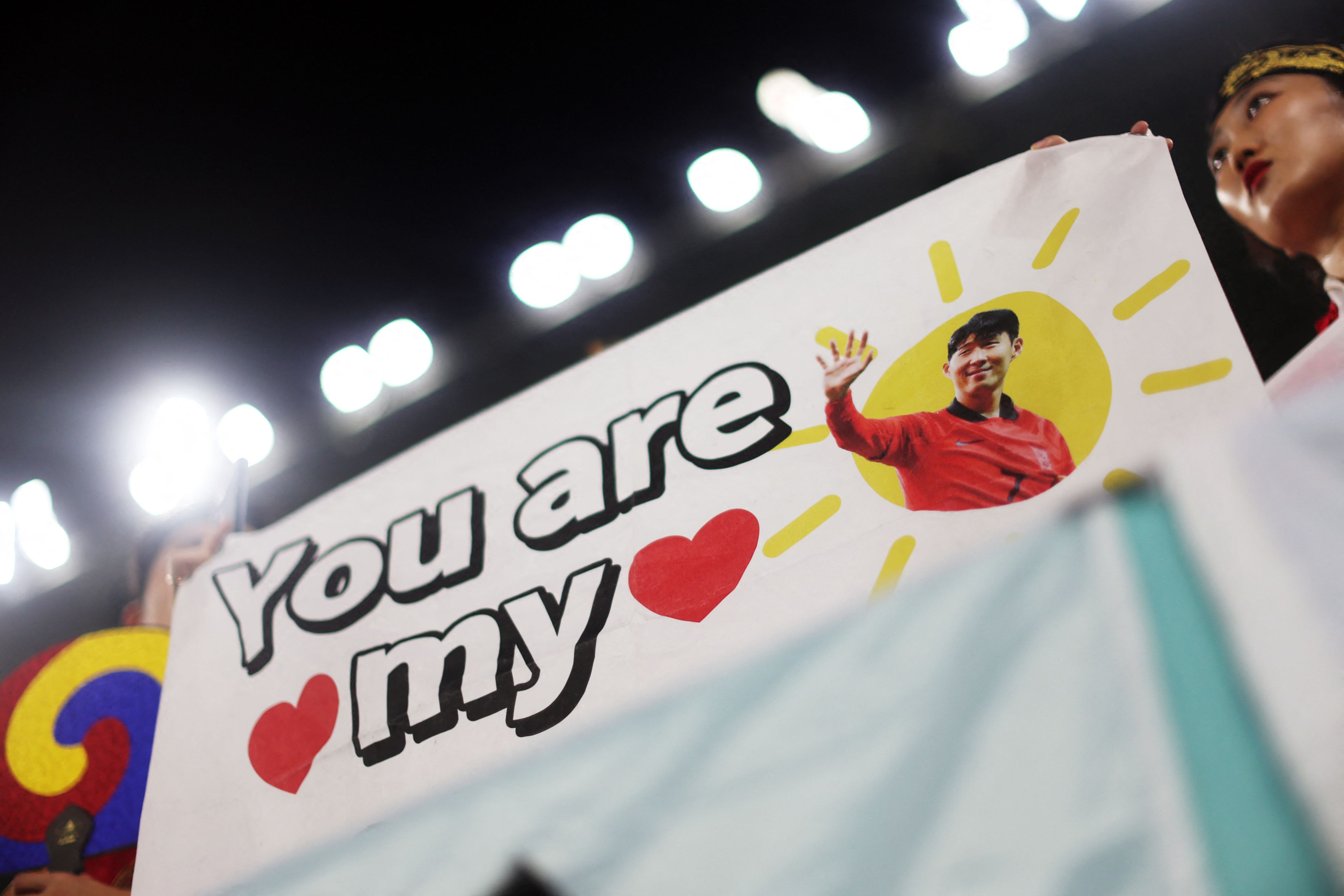 South Korean fans hold a banner in support of Son Heung-min during a match against Brazil at the 2022 FIFA World Cup in Qatar on Dec. 5. (© Reuters)