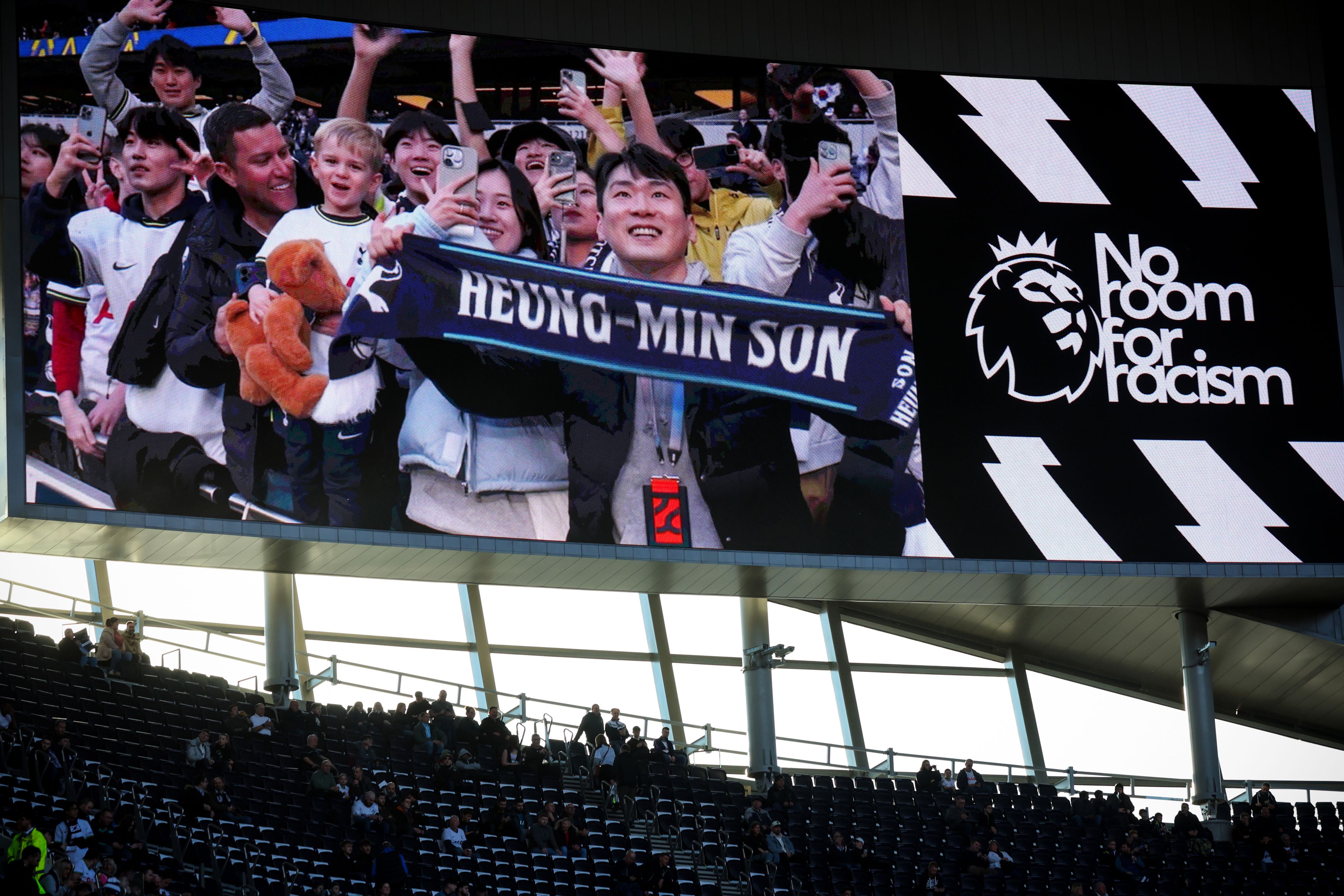 A Son fan is seen next to the Premier League's "No Room for Racism" campaign logo at Tottenham Hotspur Stadium, London, U.K., on Feb 19. (© Getty Images)