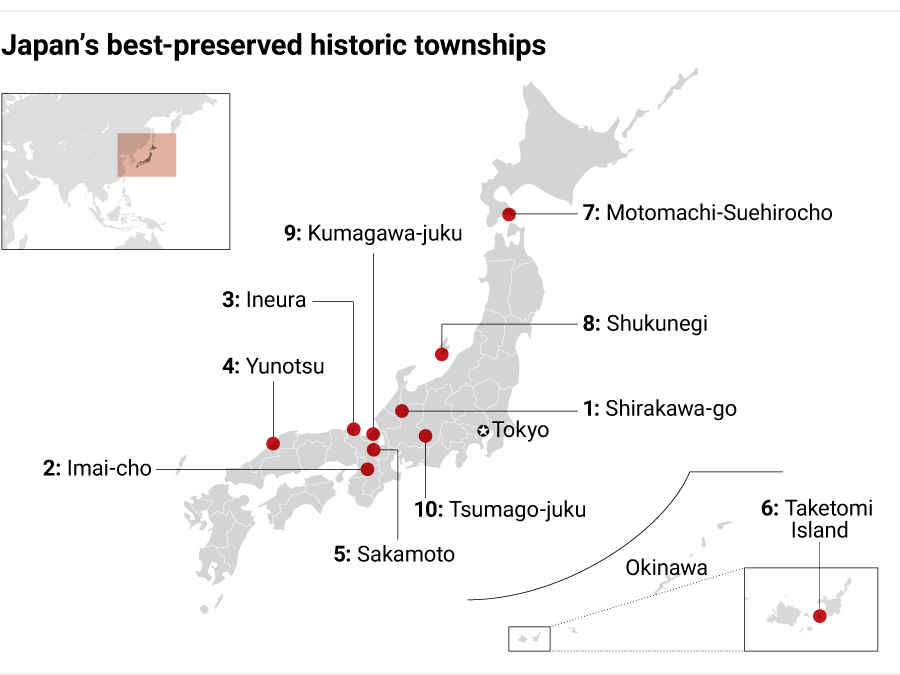 Survey method: A list of 27 areas selected from 129 Important Preservation Districts for Groups of Traditional Buildings across Japan was compiled with the cooperation of Shoko Umezu and Miki Yamada. From the selected areas, we asked seven experts to choose their top 10, based on two criteria: the aesthetic appeal of the townscape, including preservation efforts, and their attractiveness as tourist destinations. Our editorial team tallied the results.