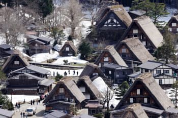 In Shirakawa-go, one of Japan's snowiest regions, the gassho-style homes -- traditional farmhouses with steep thatched roofs shaped like praying hands -- remain deeply covered by snow in late March. Some 80% of visitors appear to be foreign tourists. The thatched roofs are steep and thick to withstand heavy snow. Under them are huge, two- or three-story attics that were previously used to raise silkworms. This year is the 30th anniversary of the village becoming a UNESCO World Heritage Site, in 1995.