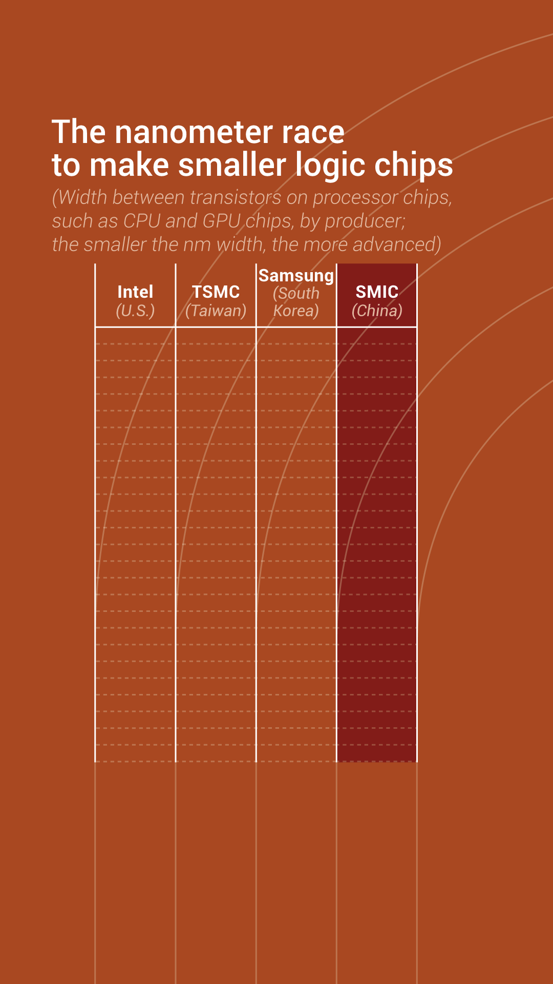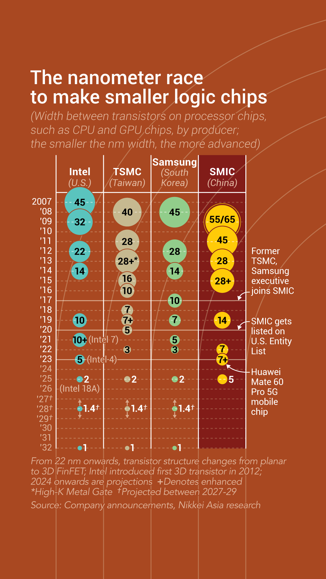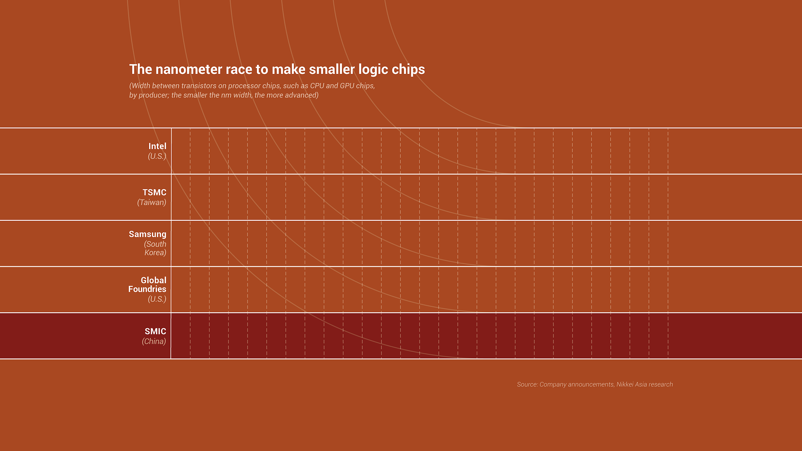 “It's harder to run faster than the fastest one of the group. But once the fastest one can't run any faster … then others catch up to it,” said Dan Hutcheson, an industry veteran and vice chair of Canadian research firm TechInsights. "In a chip race, the leader can not afford to trip, even once."