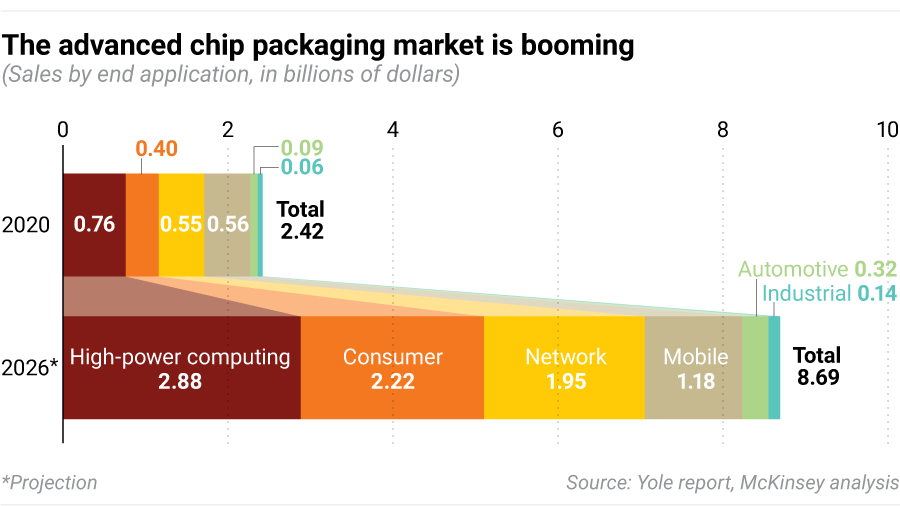 In 2021, industry giants like Intel and TSMC embarked on the biggest chip packaging expansion ever, pledging a total of more than $20 billion worth of multiyear investment into the technology. Even the U.S. government has started paying attention, earmarking an additional $3 billion for research into chip packaging, on top of its $52 billion in semiconductor subsidies.