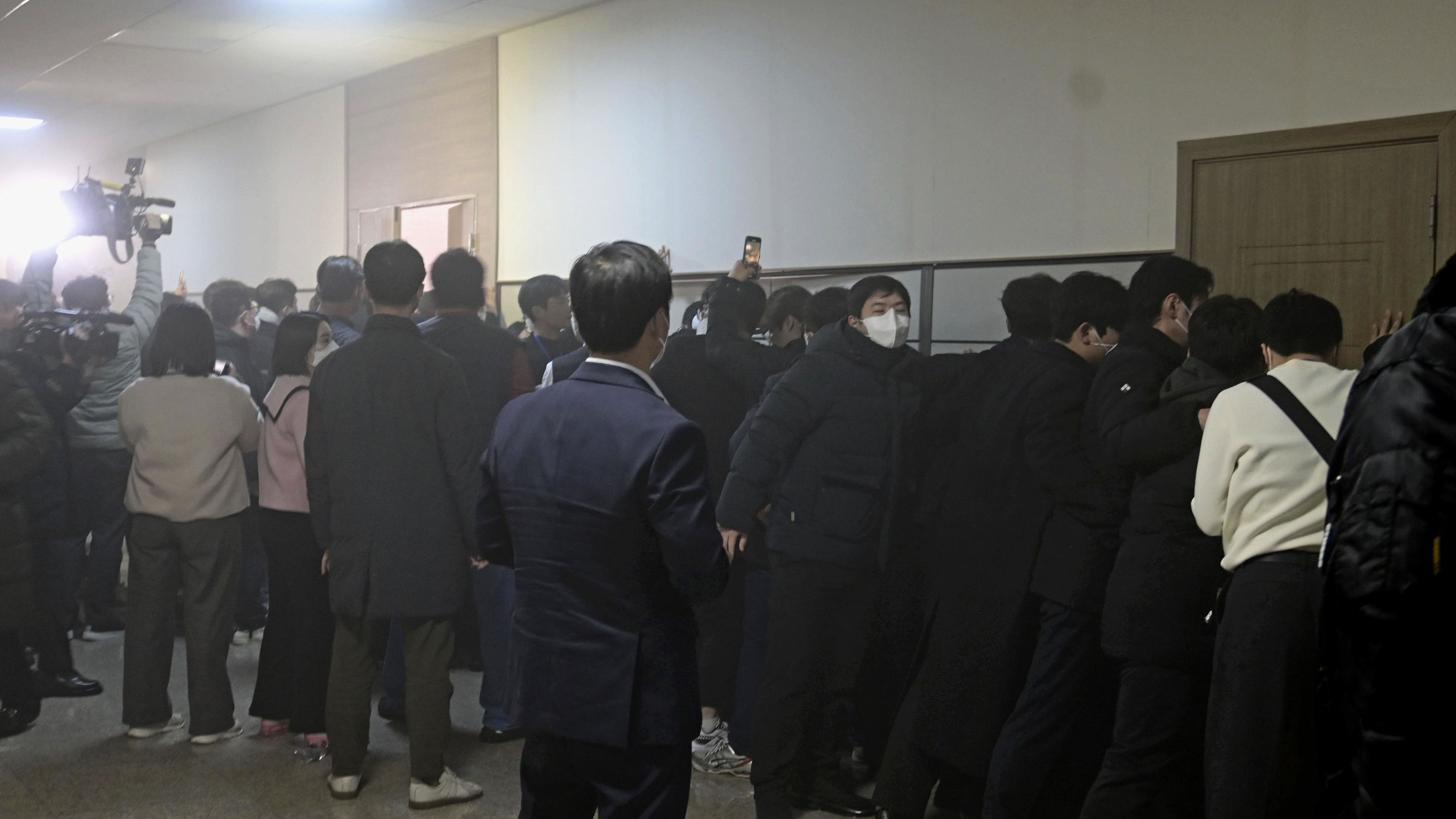 Lawmakers brace the doors to prevent the military from entering the National Assembly in Seoul on Dec. 4. (Photo by Kyodo)