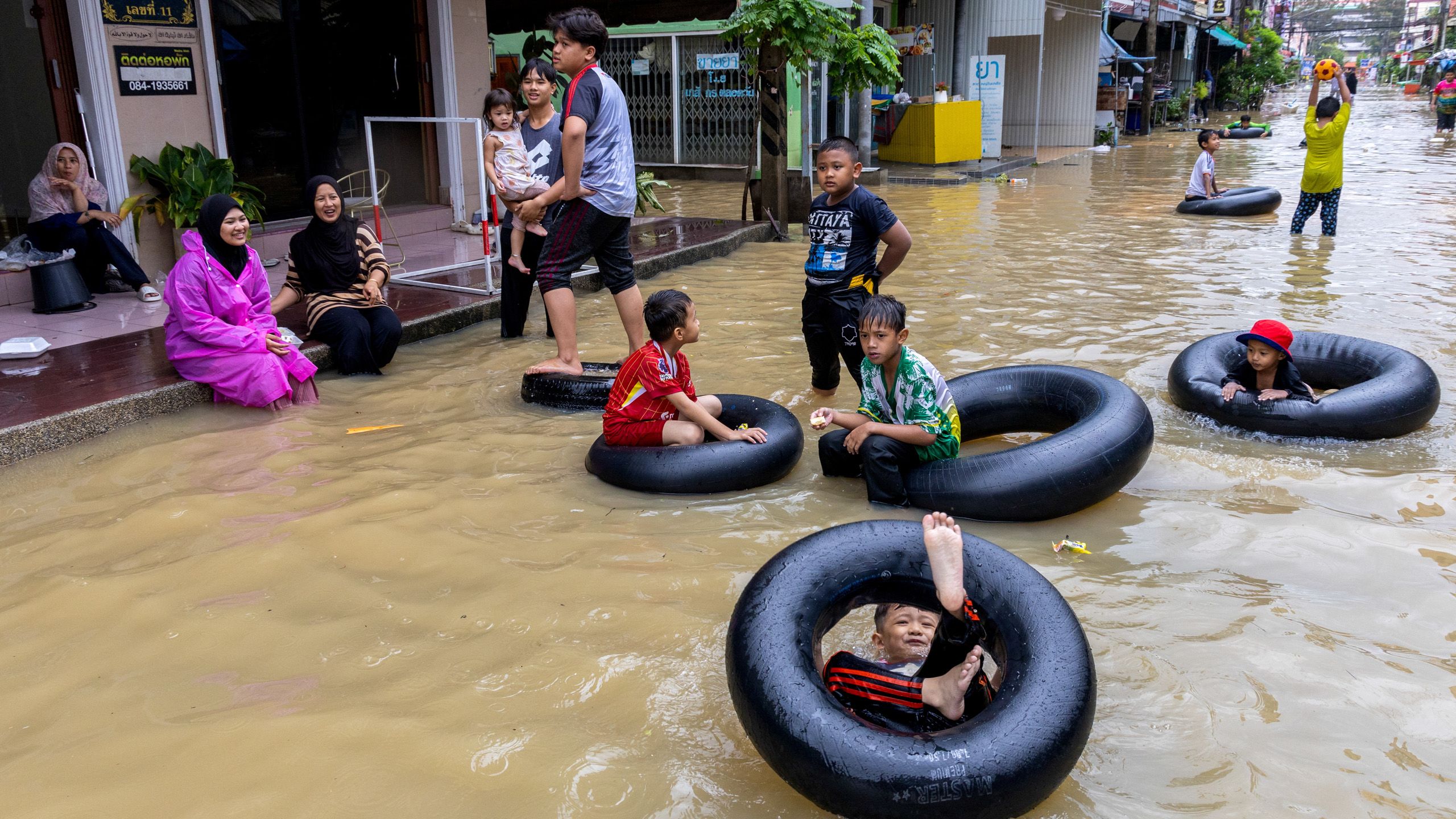 Children play on a flooded street in Hat Yai district, Songklha province, Thailand, on Nov. 30. (Photo by Reuters)