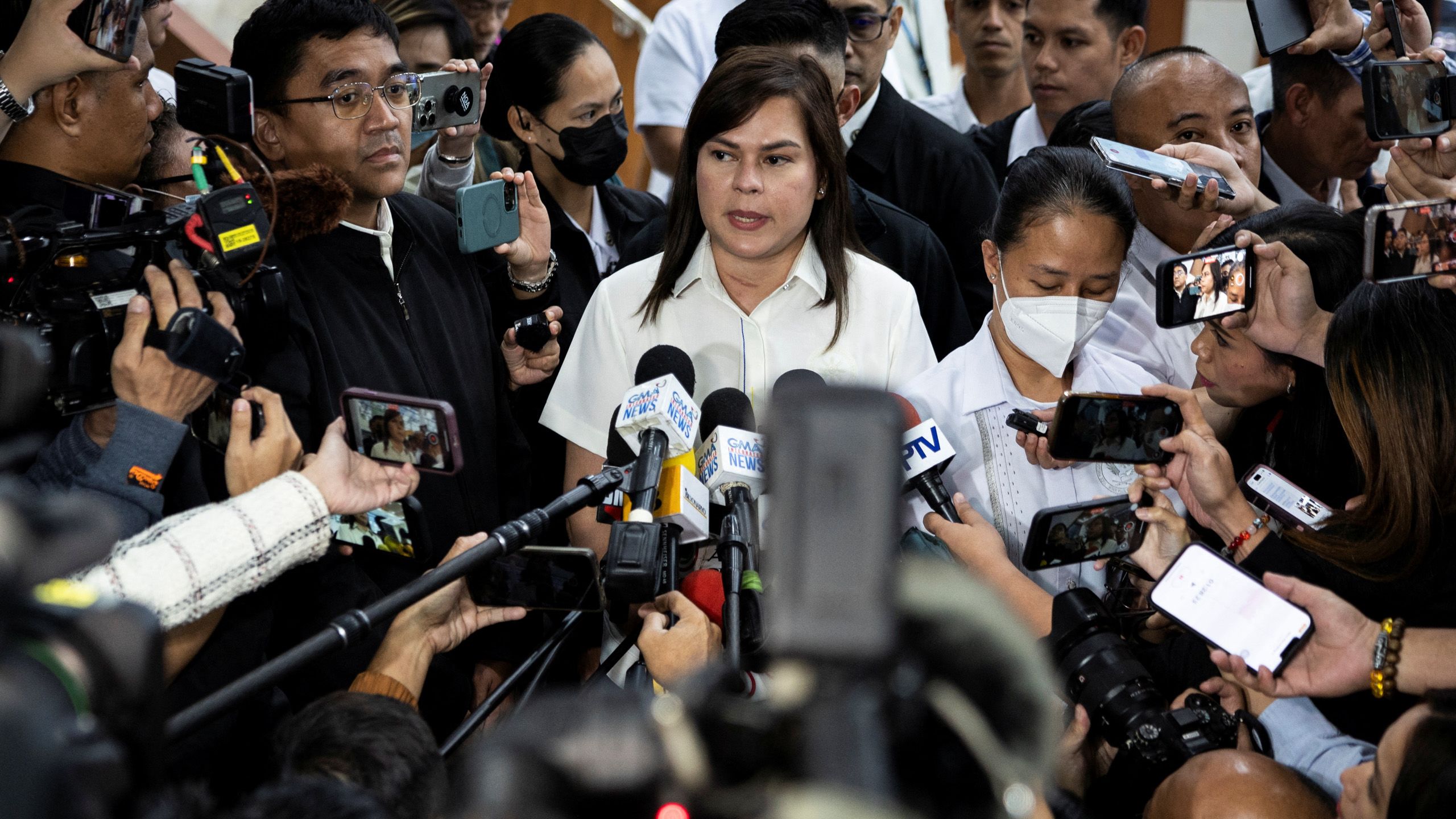 Philippine Vice President Sara Duterte speaks to the media at the House of Representatives, in Quezon City, Philippines, on Nov. 25. Duterte said on Nov. 23 that she has ordered a hit against the Marcoses that is to be carried out if she is killed. (Photo by Getty Images)