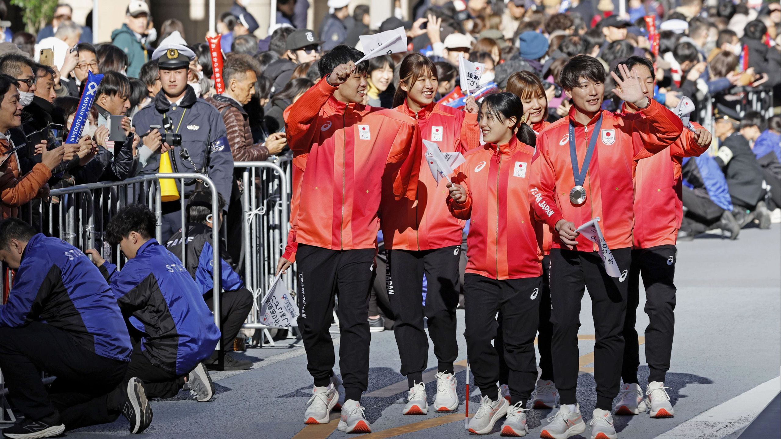 About 100 Japanese athletes who competed in the Paris Olympics and Paralympics this summer tour during a parade in Nihonbashi on Nov. 30 to thank fans. (Photo by Kyodo)