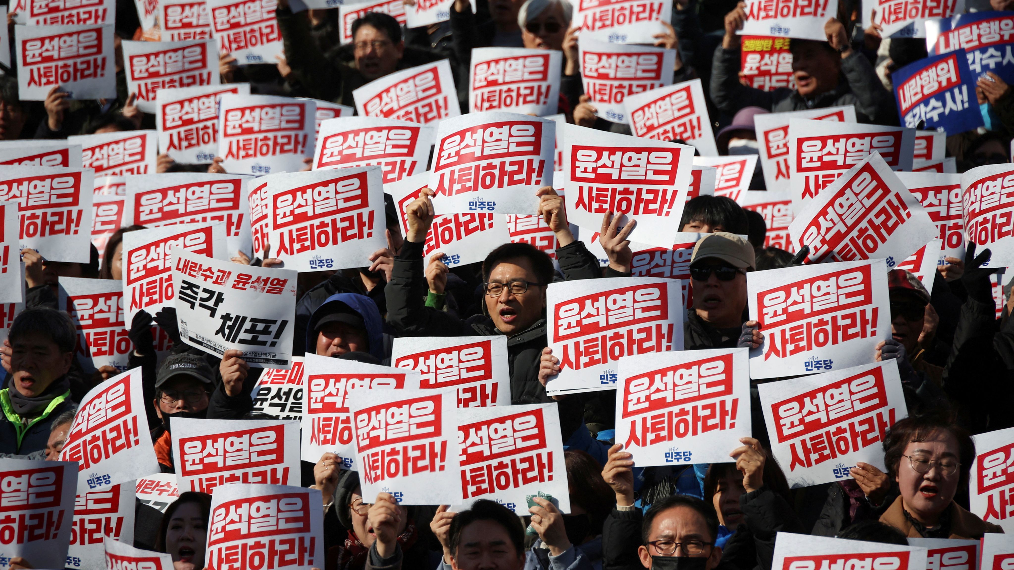 Protesters hold up signs that read "Step down President Yoon Suk Yeol" as people and lawmakers attend a rally to condemn South Korean president’s surprise declarations of martial law and to call for his resignation at the National Assembly in Seoul on Dec. 4. (Photo by Reuters)