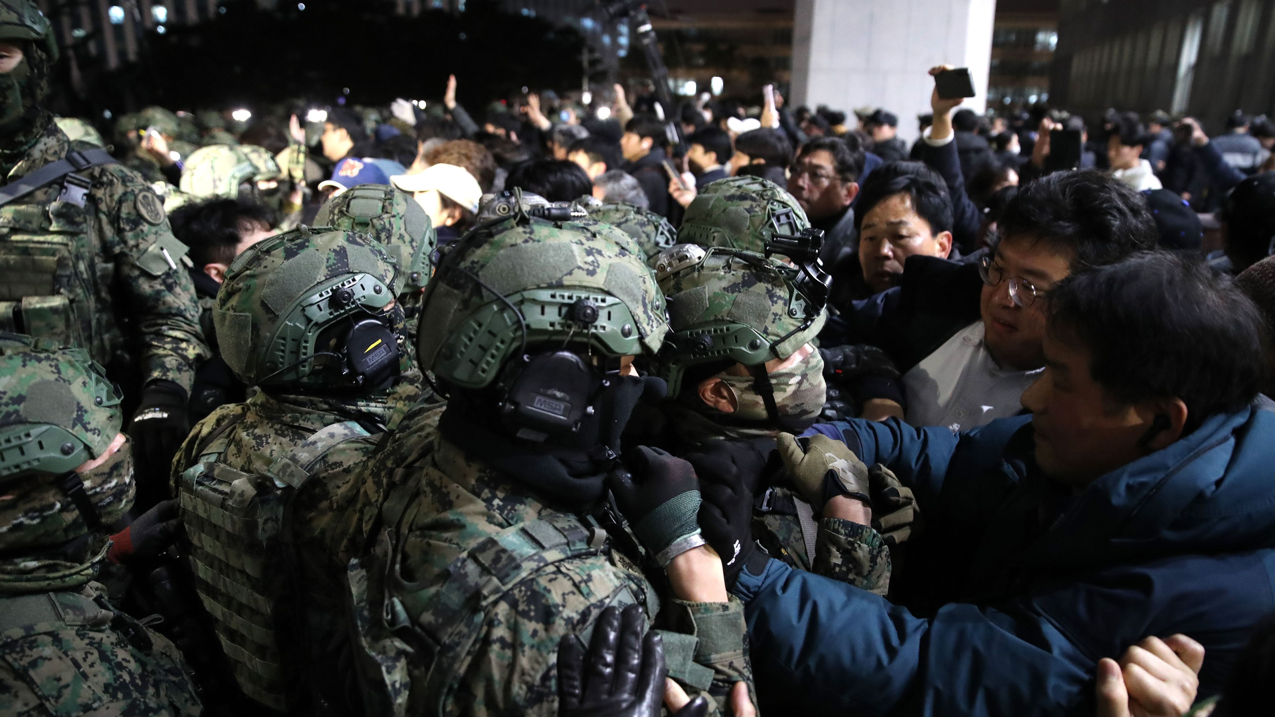 South Korean soldiers try get into the National Assembly on Dec. 4 in Seoul. (Photo by Getty Images)