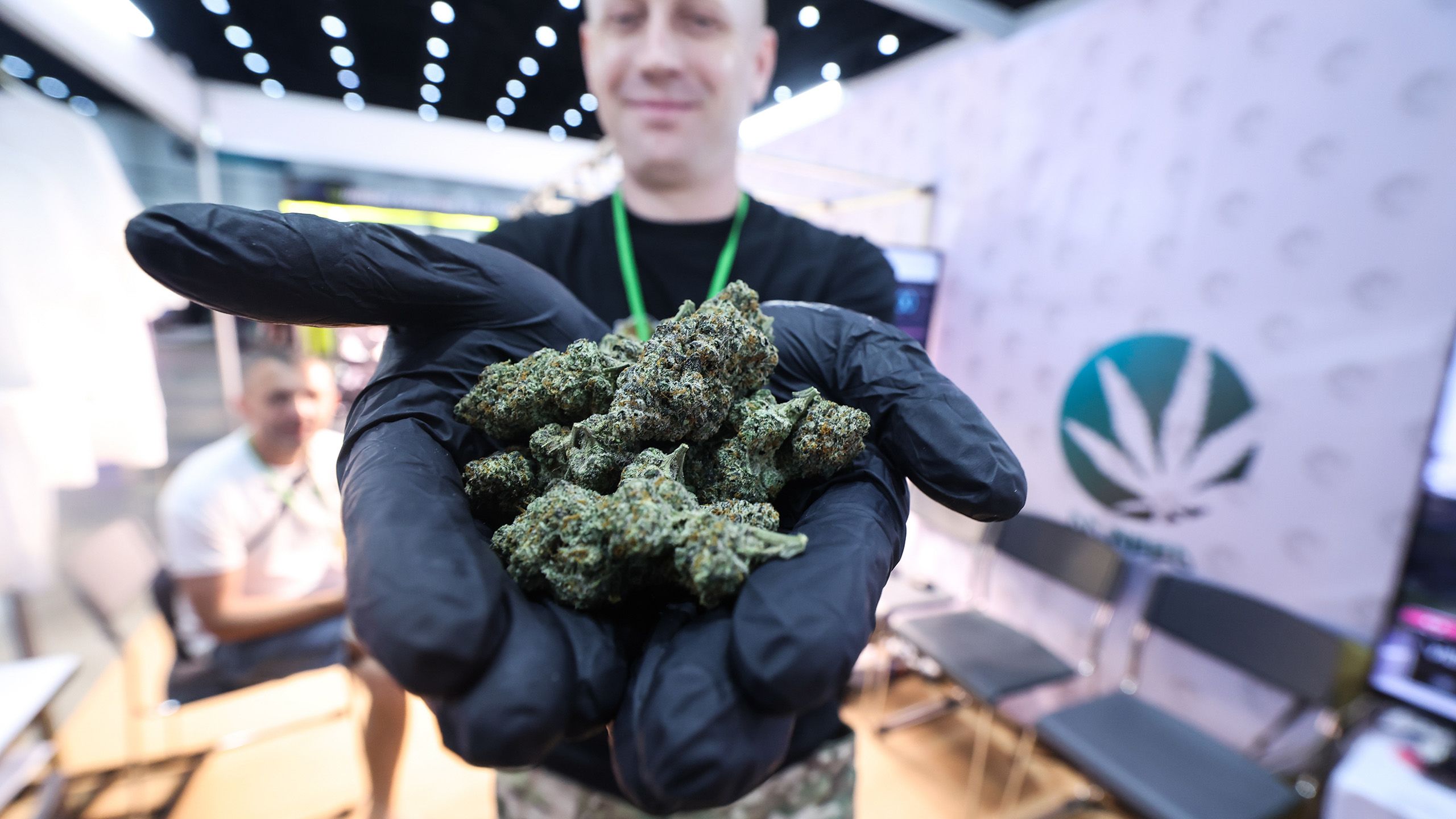 An exhibitor shows cannabis buds during an Asia International HEMP Expo and Forum. (Photo by Yuki Kohara)