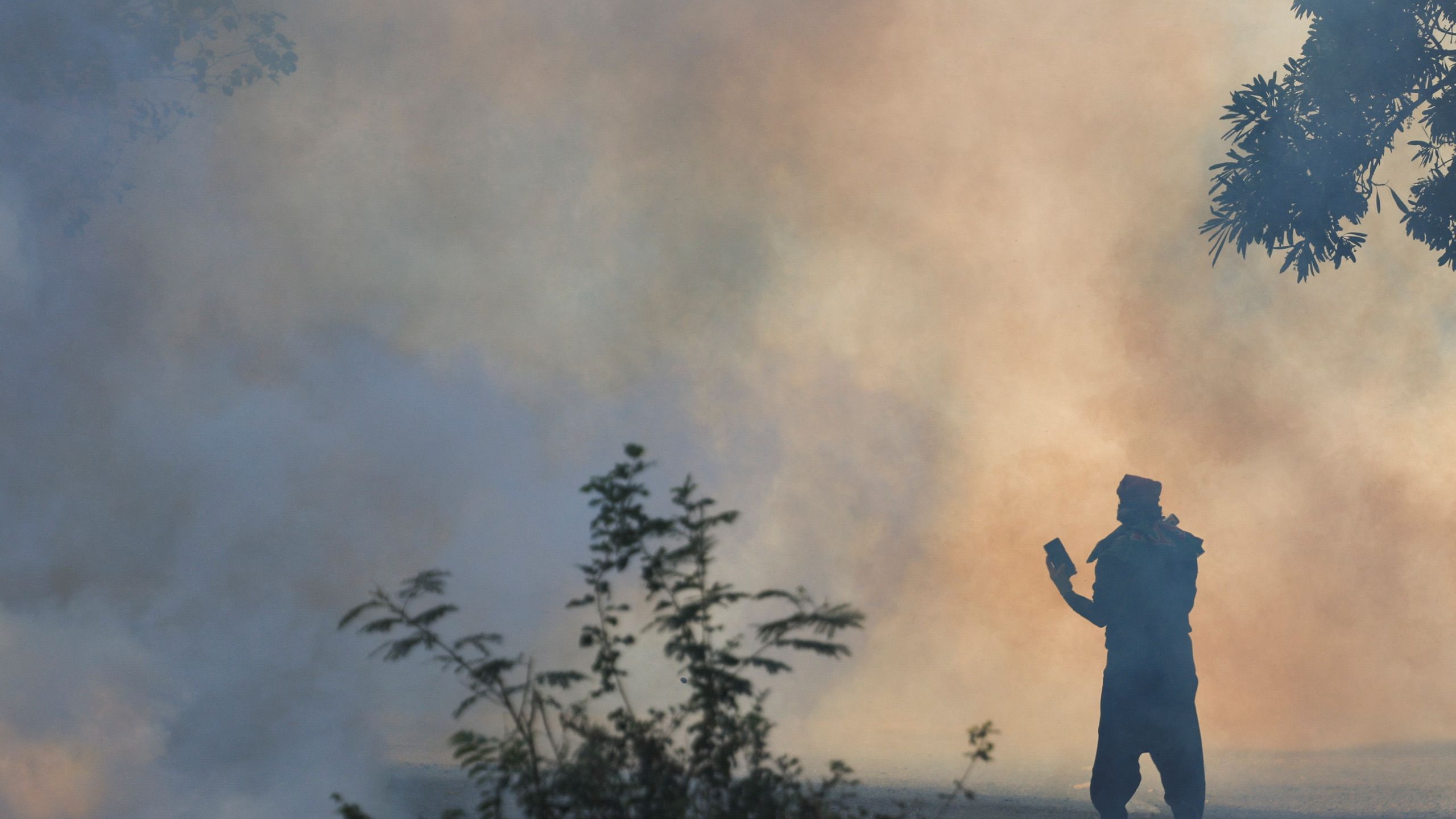 A supporter of the former Pakistani Prime Minister Imran Khan's party, Pakistan Tehreek-e-Insaf (PTI), holds a mobile phone amid tear gas smoke as he attends an anti-government protest demanding the release of Khan, in Islamabad on Nov. 26.