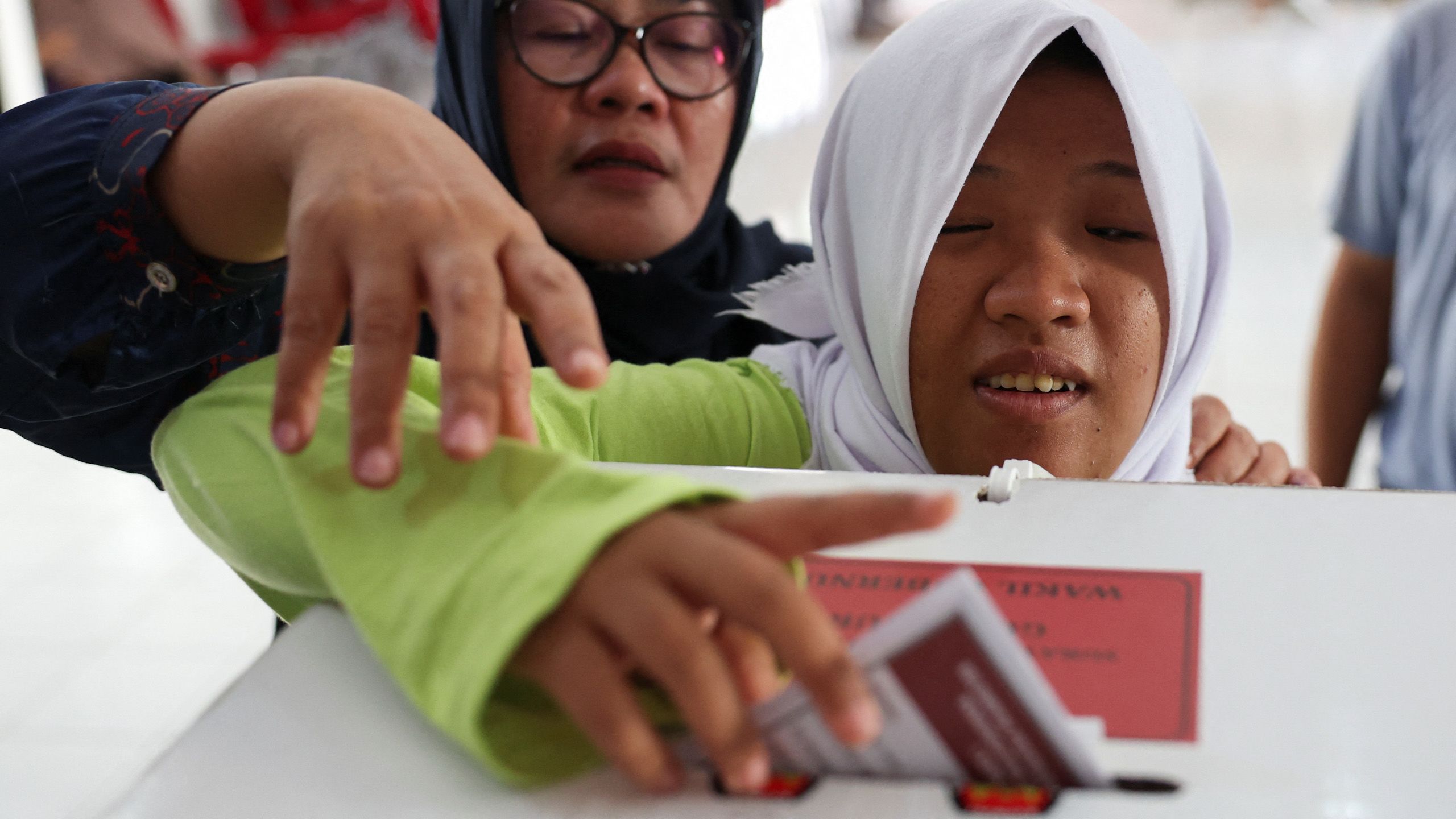 A blind woman with her helper votes at a polling station during regional elections in Jakarta on Nov. 27. Indonesians cast their votes for the governors of 37 provinces as well as 508 municipalities and regencies nationwide, the first time that the country held regional elections simultaneously.