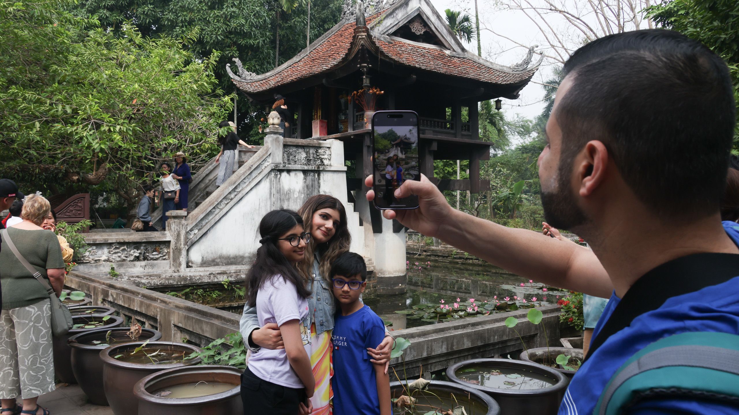 Tourists take photos in front of the Chua Mot Cot, or One Pillar Pagoda, a historic Buddhist temple in Hanoi on Dec. 2. (Photo by Yuki Kohara)