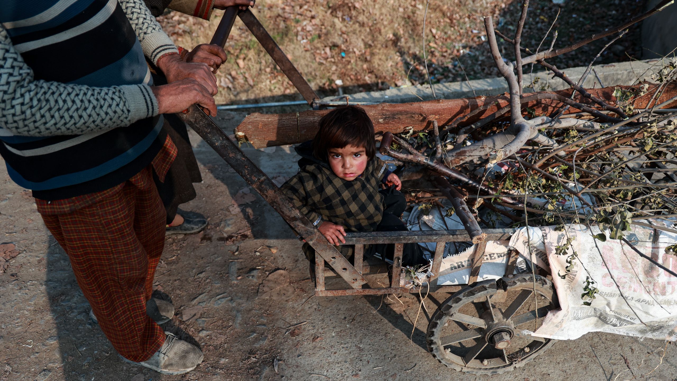 An elderly couple pushes a hand cart filled with branches as their granddaughter sits inside, in Jammu and Kashmir, India, on Nov 28. (Photo by Getty Images)