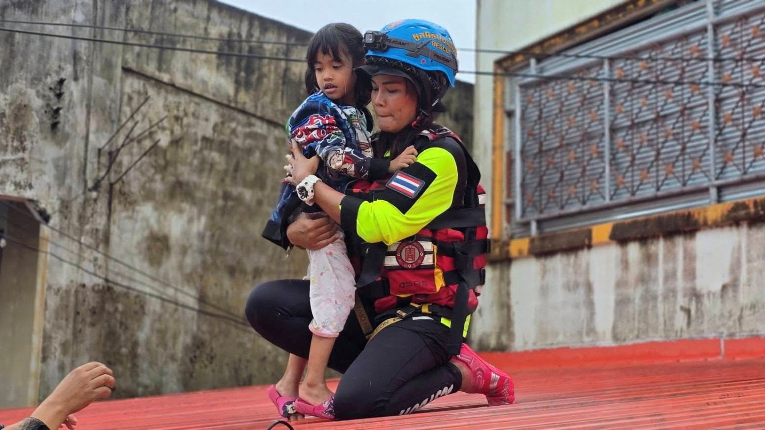 A rescue worker evacuates a child stranded by flooding in Sateng Nok, Yala province, Thailand, on Nov. 30. (Photo by Poh Teck Tung Foundation/Reuters)