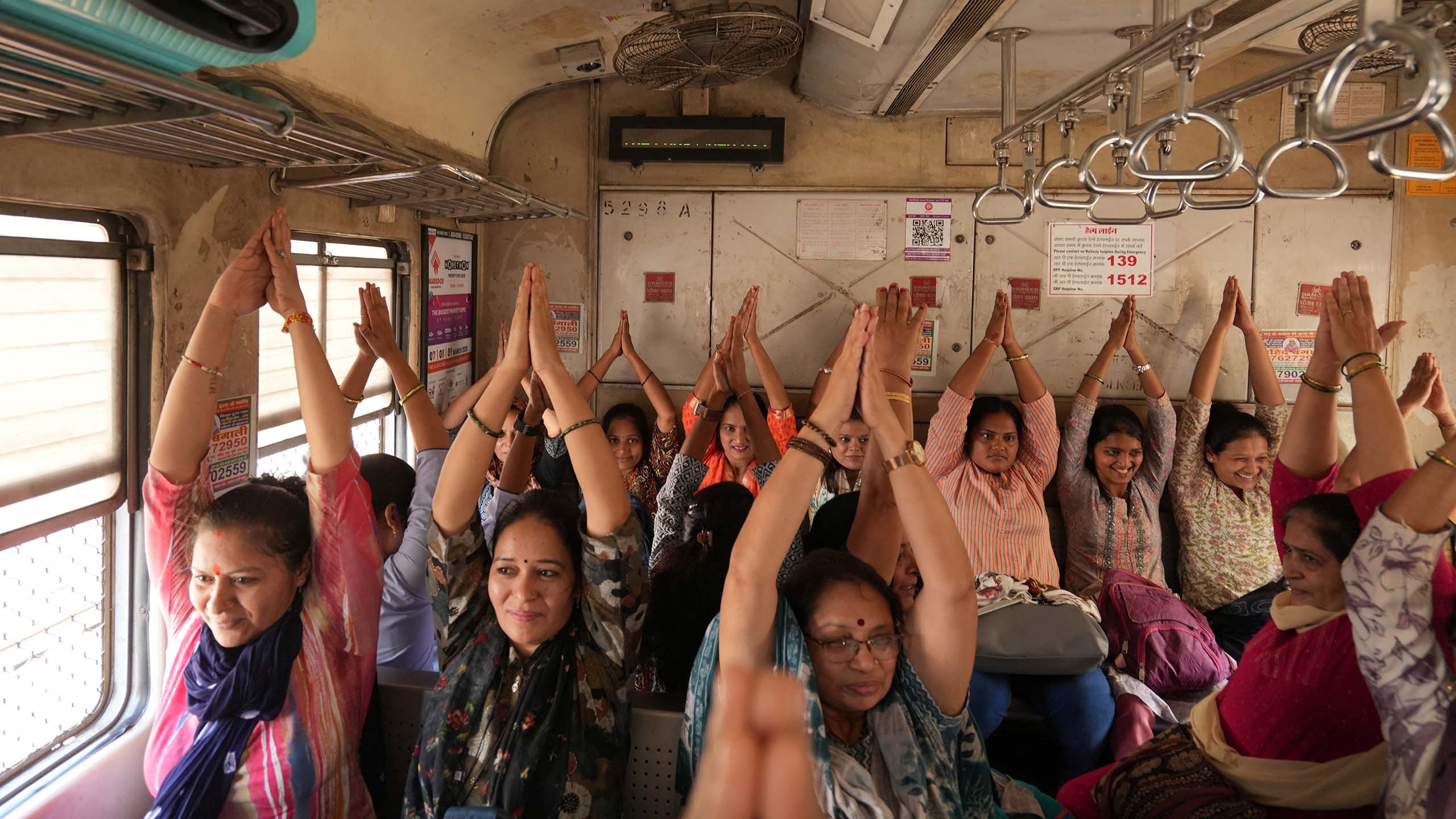 Women practice yoga while riding a local train in Mumbai as a part of International Women's Day on March 8. (Photo by Hemanshi Kamani/Reuters)
