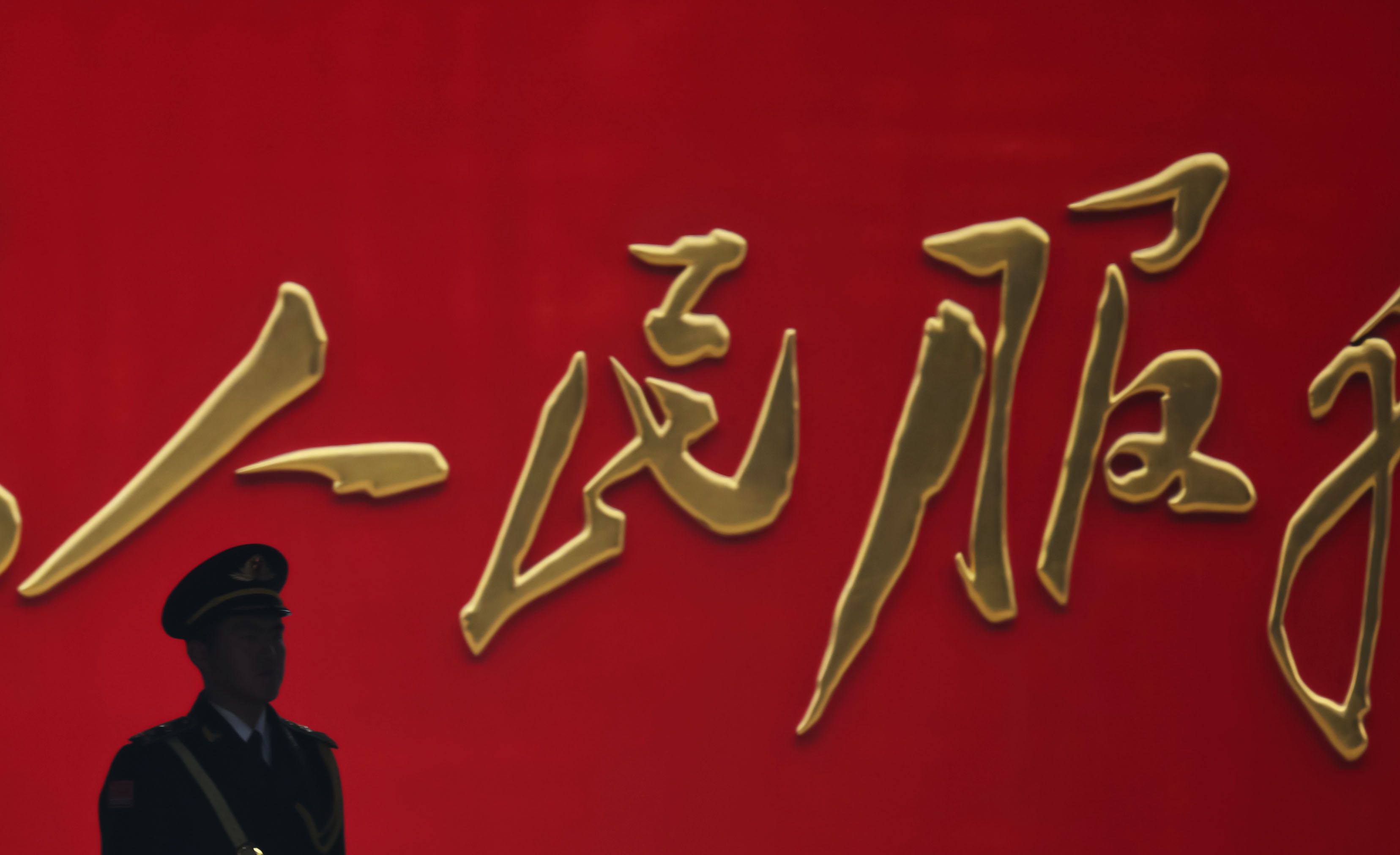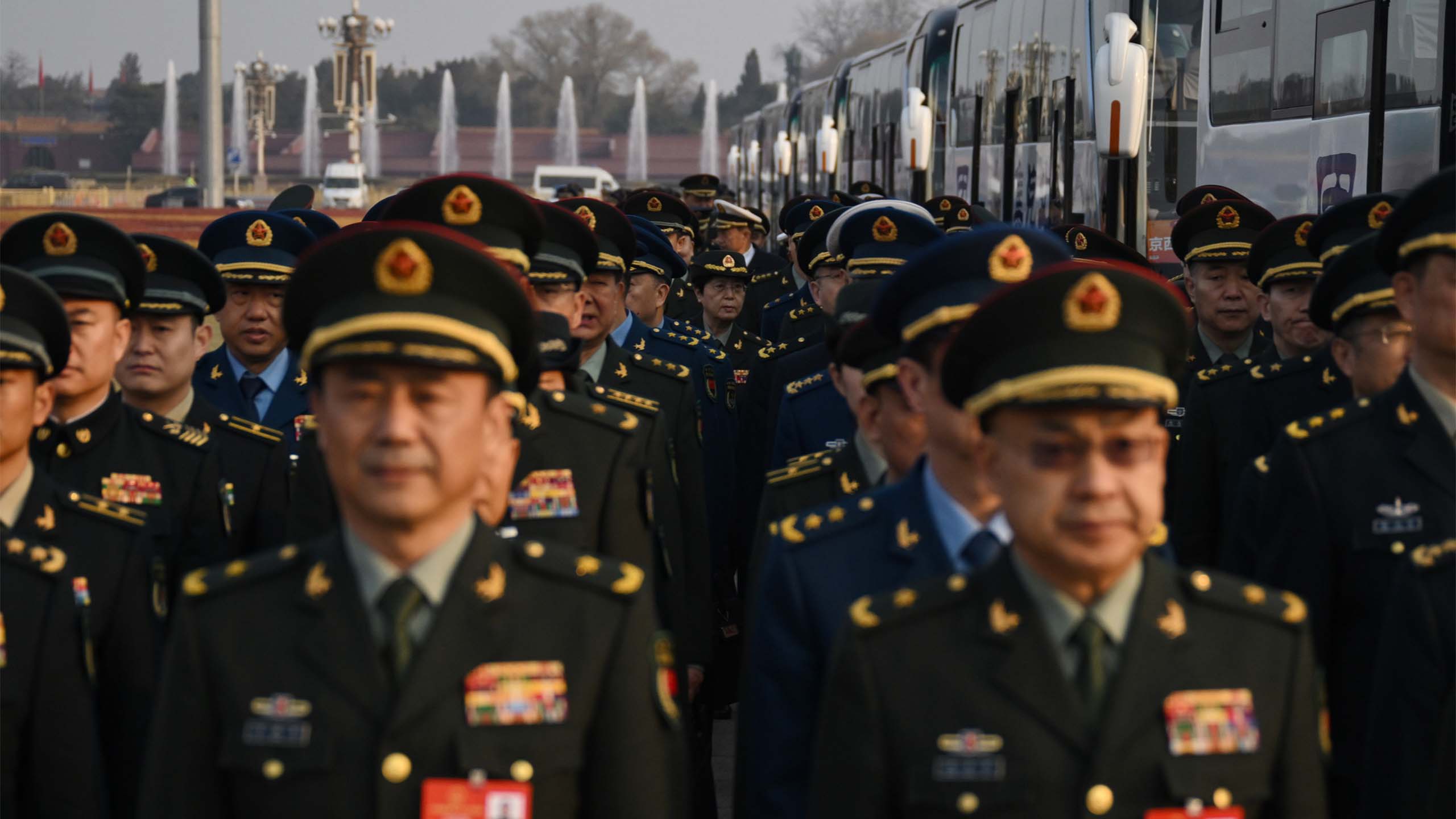 Military personnel head to the Great Hall of the People to attend the National People’s Congress on March 8 in Beijing. (Photo by Tomoki Mera)