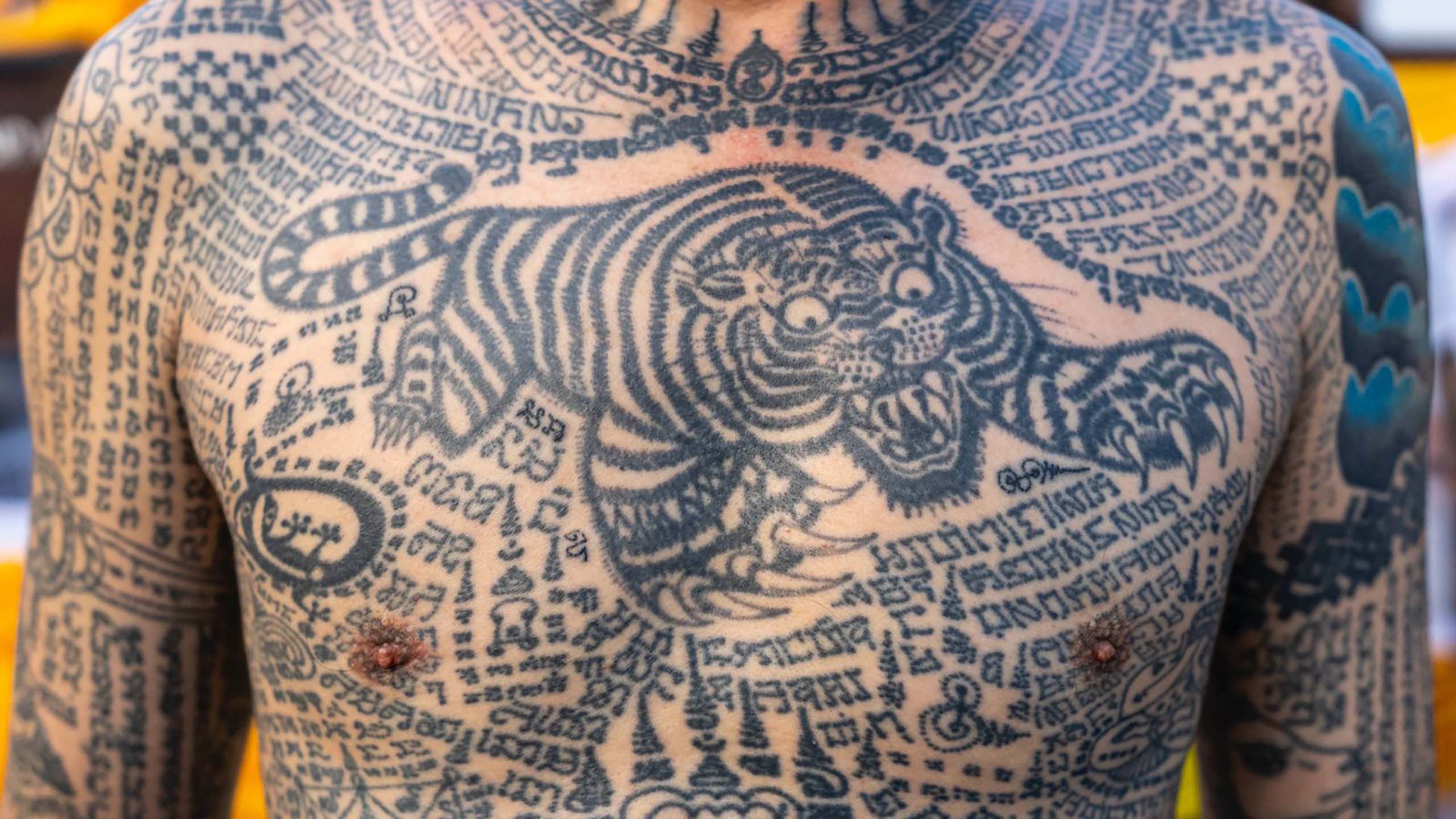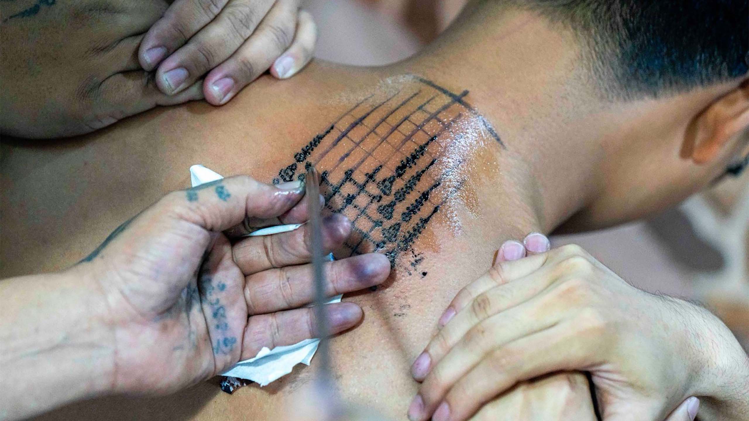 A sacred Sak Yant tattoo on the body of a devotee. Devotees who decide to have real Sak Yant tattoos made and blessed by an ajarn are supposed to follow various moral rules such as not telling lies, killing, stealing and becoming intoxicated. (Photo by Adryel Talamante)