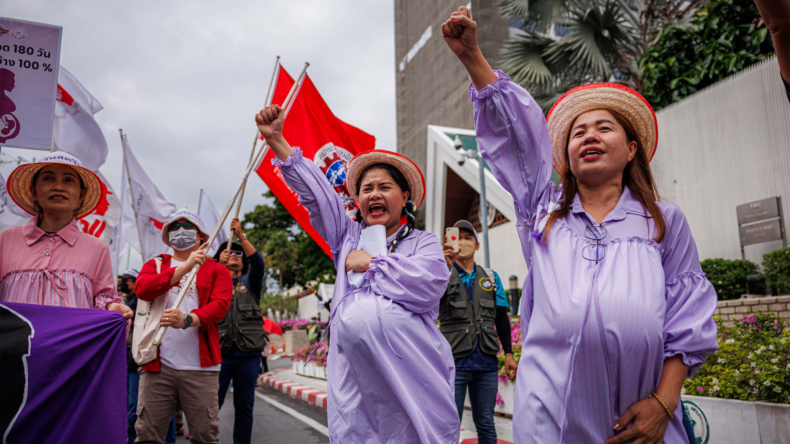 Women dressed in pregnancy costumes cheer as they head to Bangkok’s Government House on International Women's Day on March 8 to draw attention to maternity issue. The event was held to protest against gender-based discrimination and violence. (Photo by Lauren DeCicca/Getty Images)