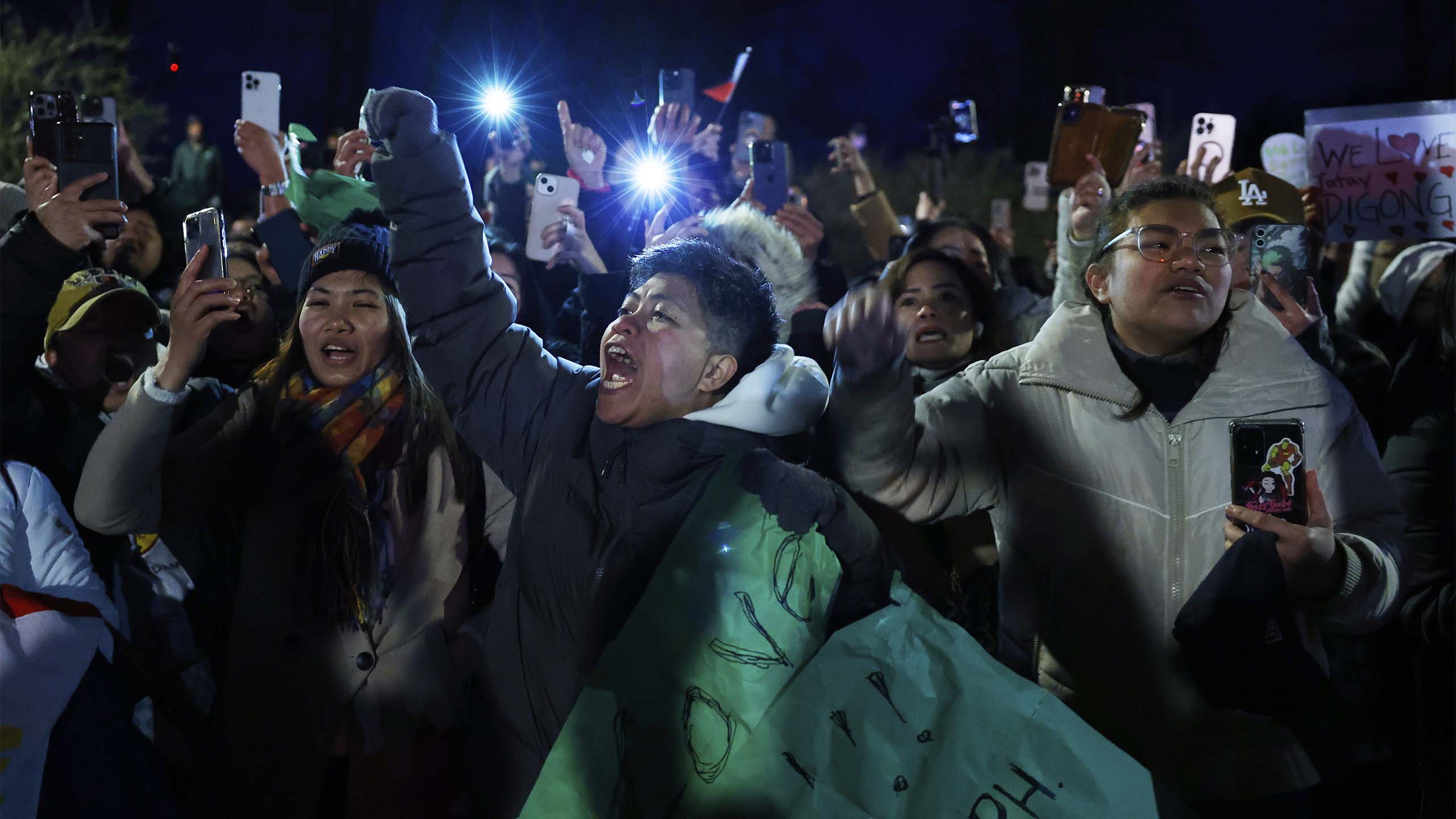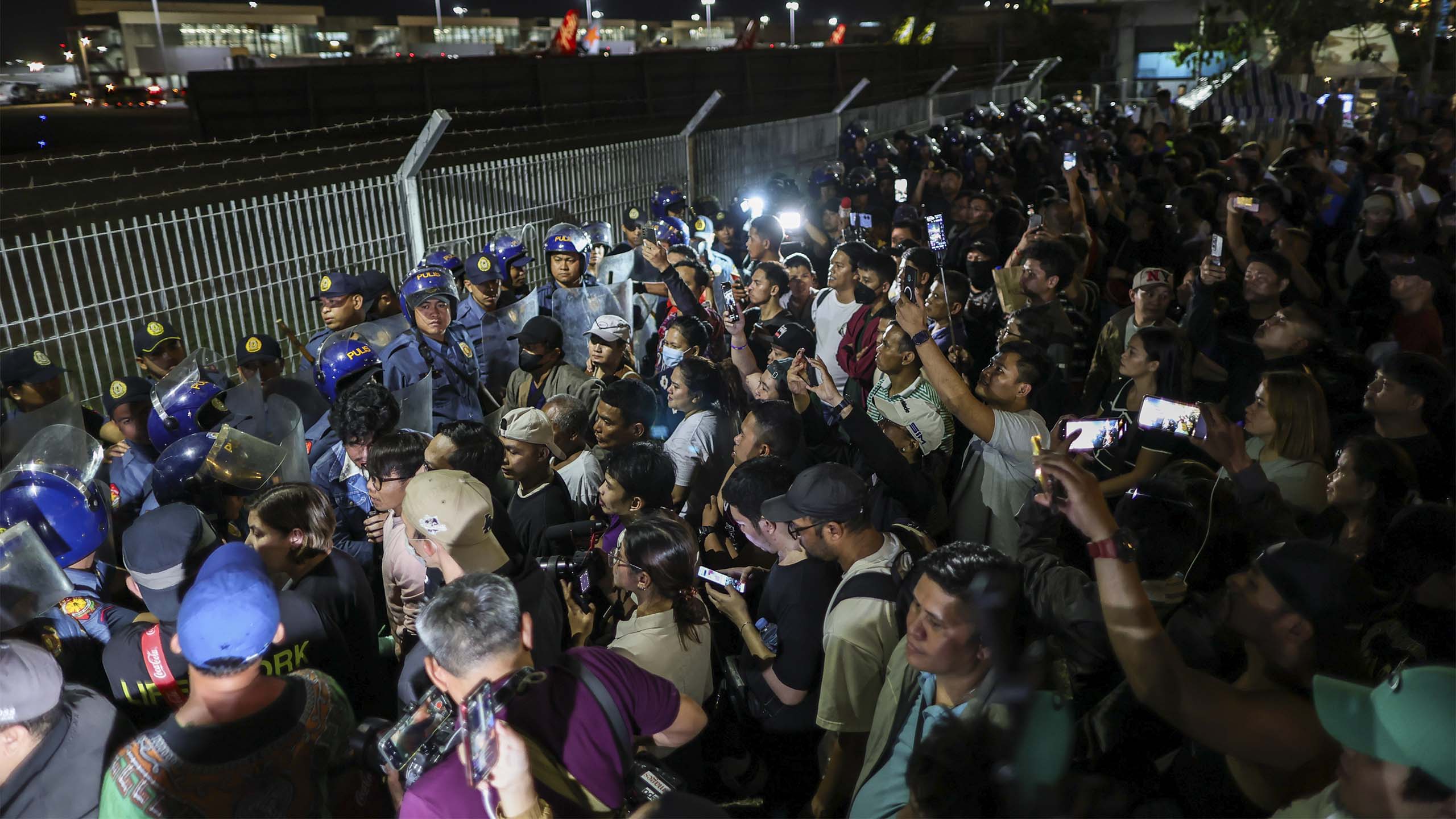 Duterte supporters gather at a fence at Villamor Air Base on March 11 upon learning that the plane taking the ex-president to The Hague had left. (Photo by Gerard Carreon/AP)