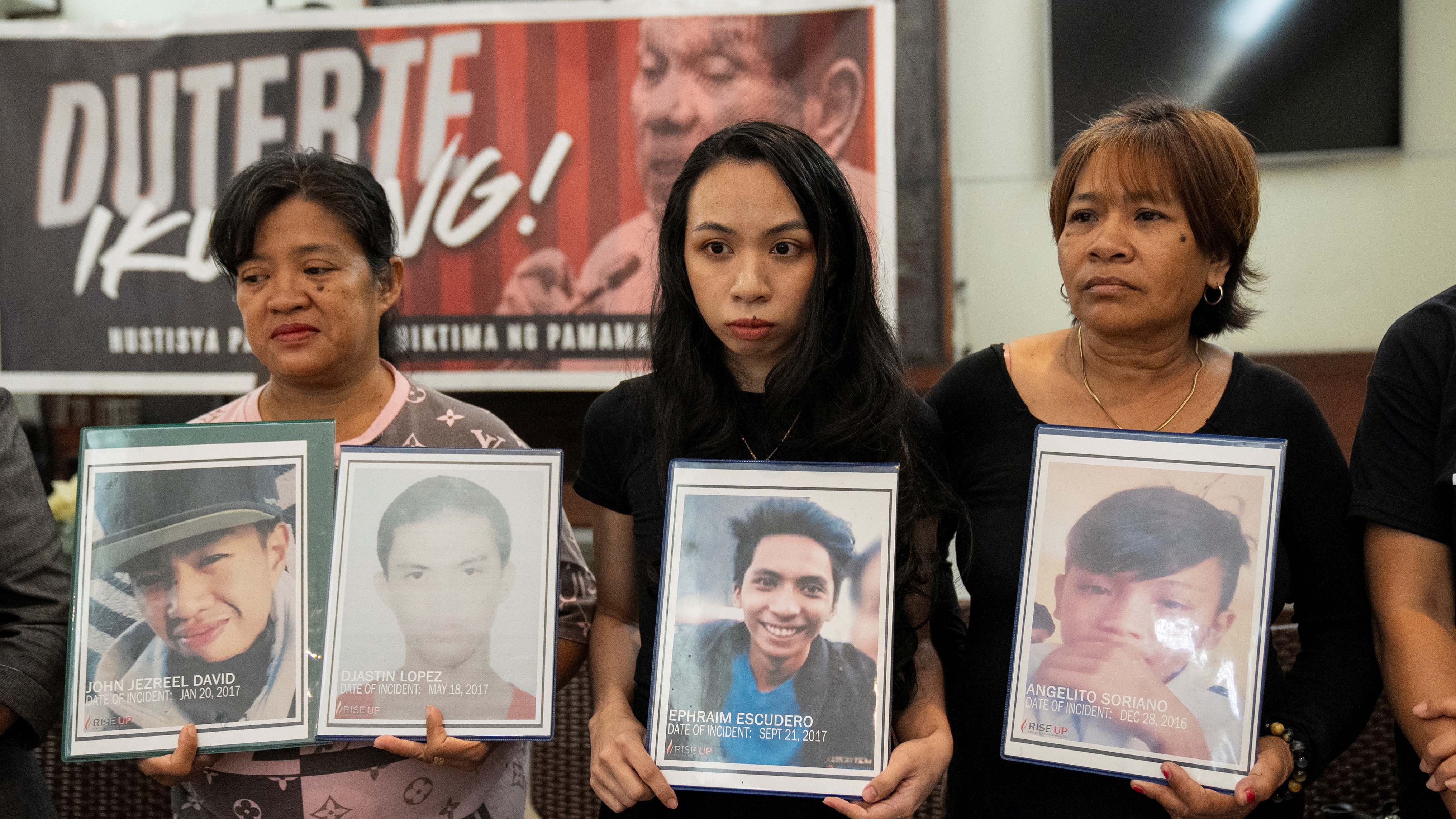 Relatives hold pictures of victims of extrajudicial killings that took place during Duterte’s drug war, at a press conference following Duterte’s arrest, in Quezon City, Metro Manila, on March 12. (Photo by Lisa Marie David/Reuters)