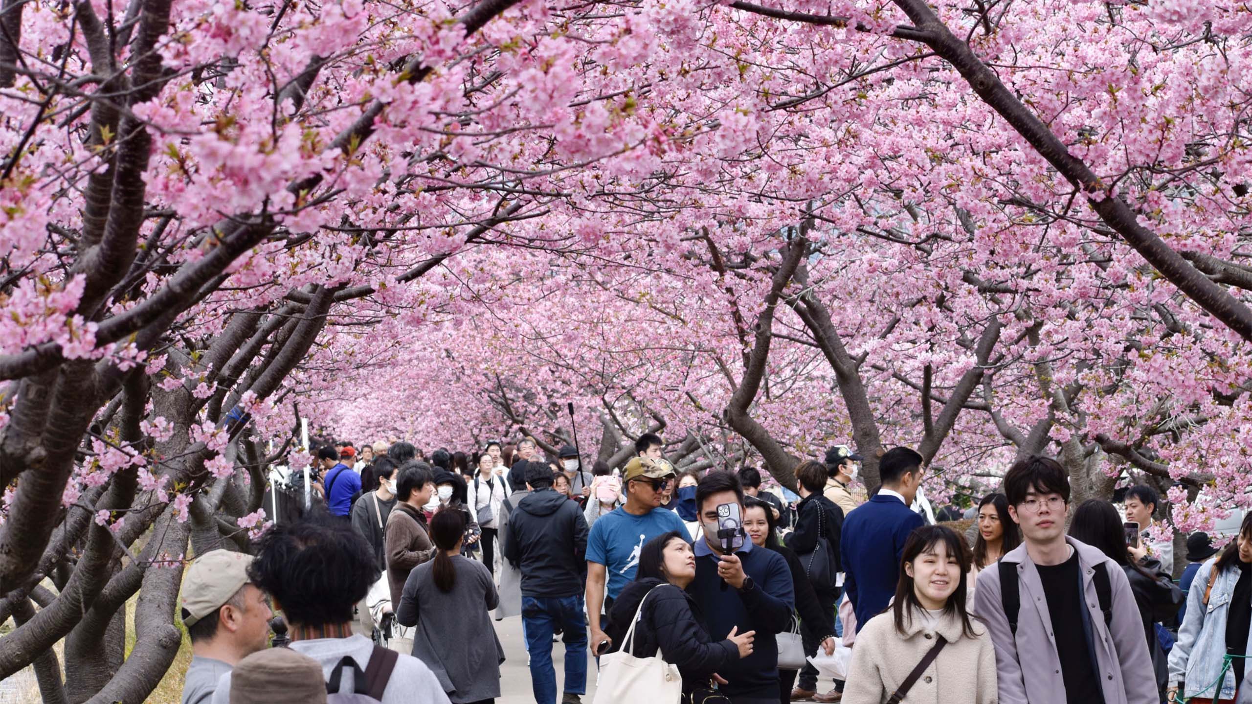 People enjoy cherry blossoms in full bloom in the town of Kawazu, Shizuoka prefecture, Japan, on March 2. Known for blooming early, the Kawazu cherry trees draw many visitors along the local river. But the blossoms bloomed later than usual this year mostly due to cold weather. (Photo by Kyodo)