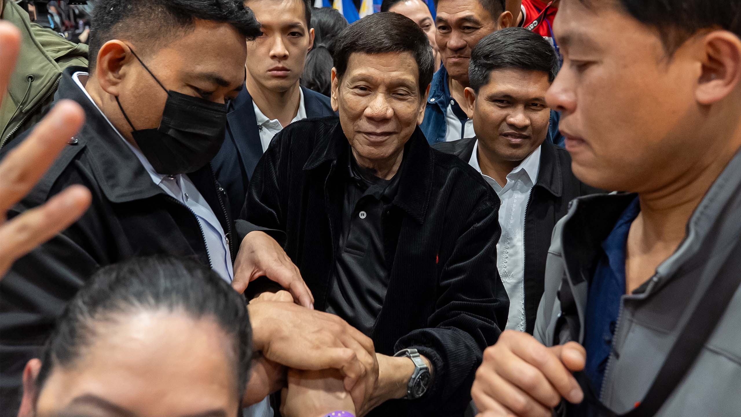 Former Philippine President Rodrigo Duterte greets supporters as he leaves a campaign attended by overseas Filipinos at Southorn Stadium in Hong Kong on March 9. (Photo by Anthony Kwan/Getty Images)