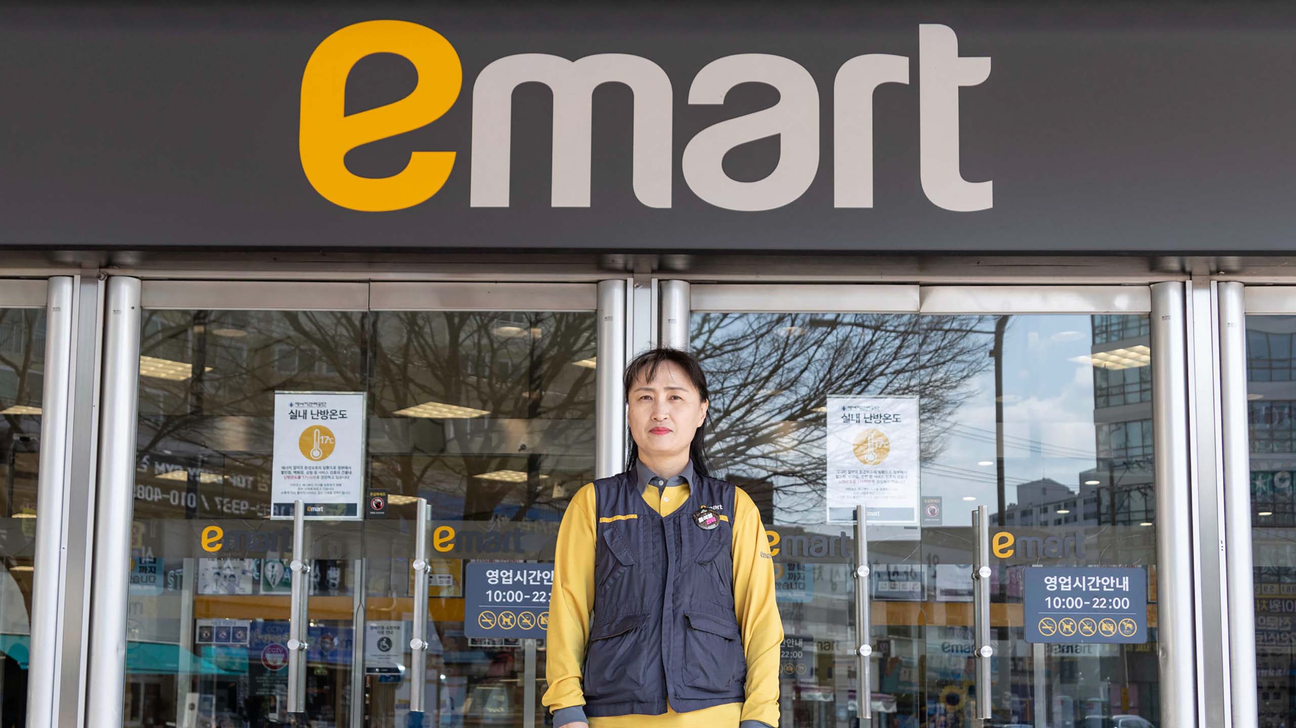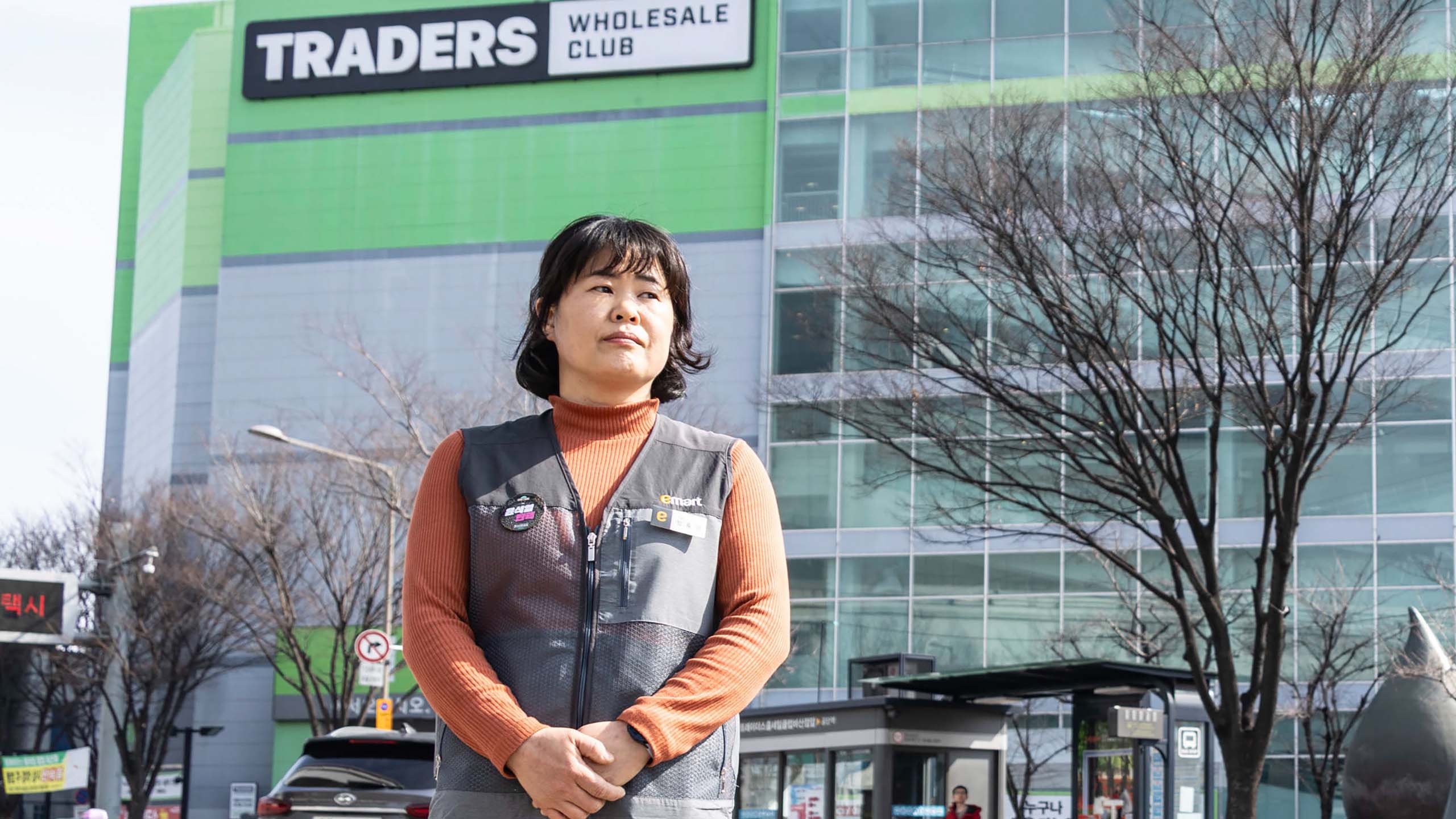 Yang Eun-young, 56, poses in front of the big-box store where she works in Daegu, South Korea, on March 7. Many women in South Korea only enter the workforce after raising children, often limiting them to low-paid jobs with minimal benefits in industries like retail. Yang says working weekend shifts means she can go weeks without catching up with her daughter. (Photo by Jean Chung)