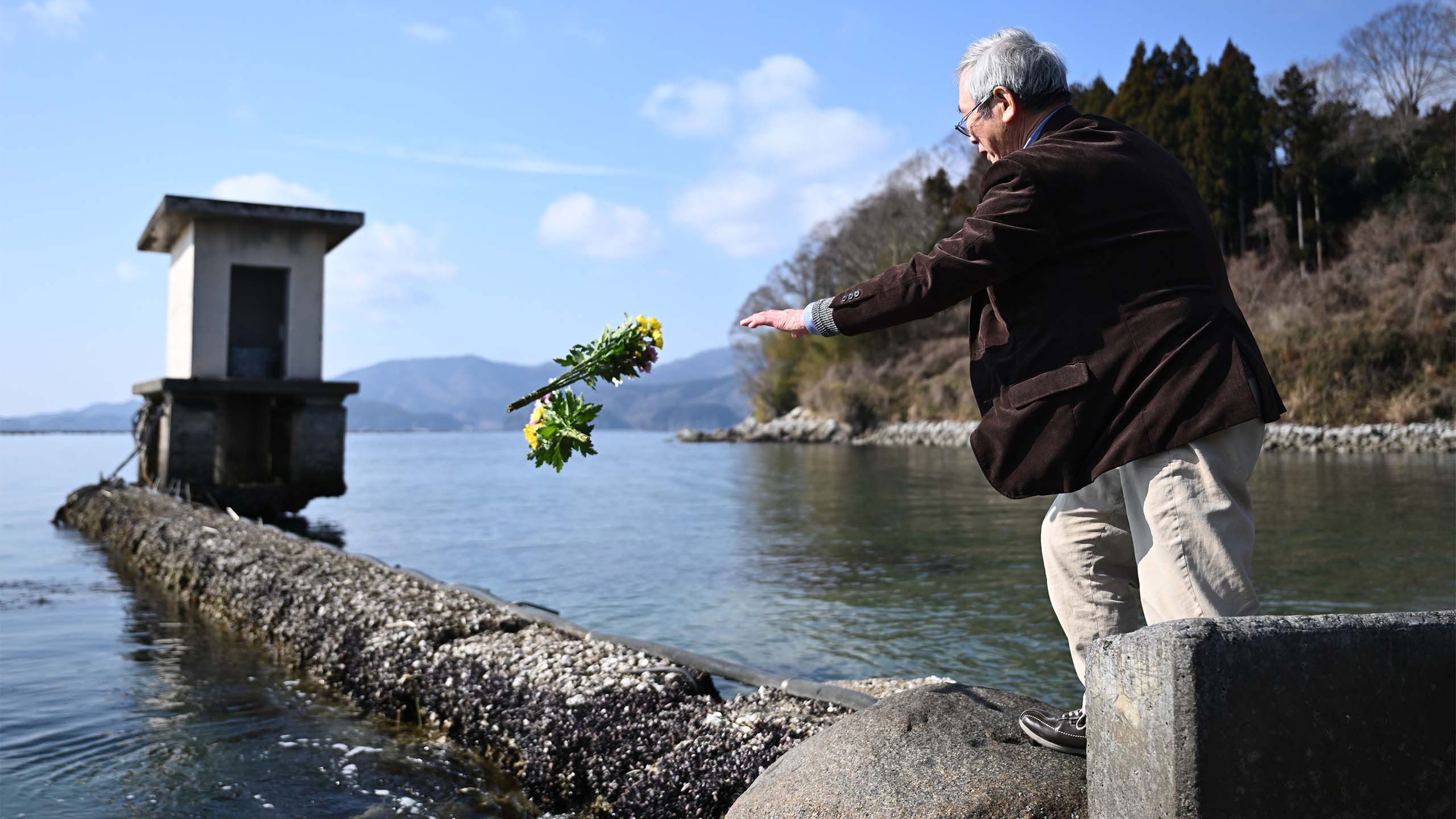 Yoshihito Sasaki throws flowers into the sea where his wife's body was found 14 years ago, in Iwate prefecture on March 11. (Photo by Mayumi Tsumita)