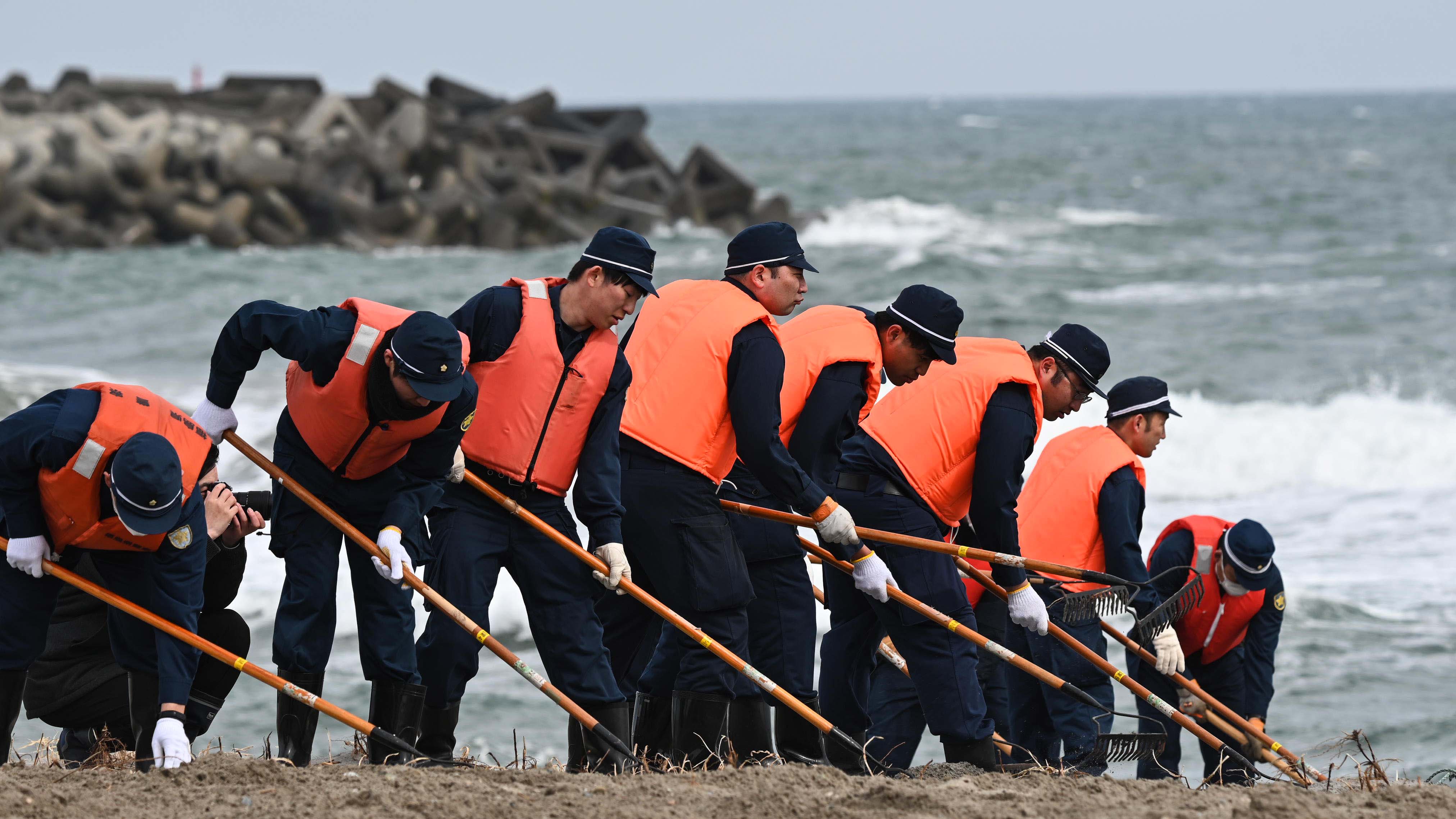Police search the beach for clues about people missing since the earthquake and tsunami 14 years ago, in Fukushima prefecture on March 11. (Photo by Sae Kamae)