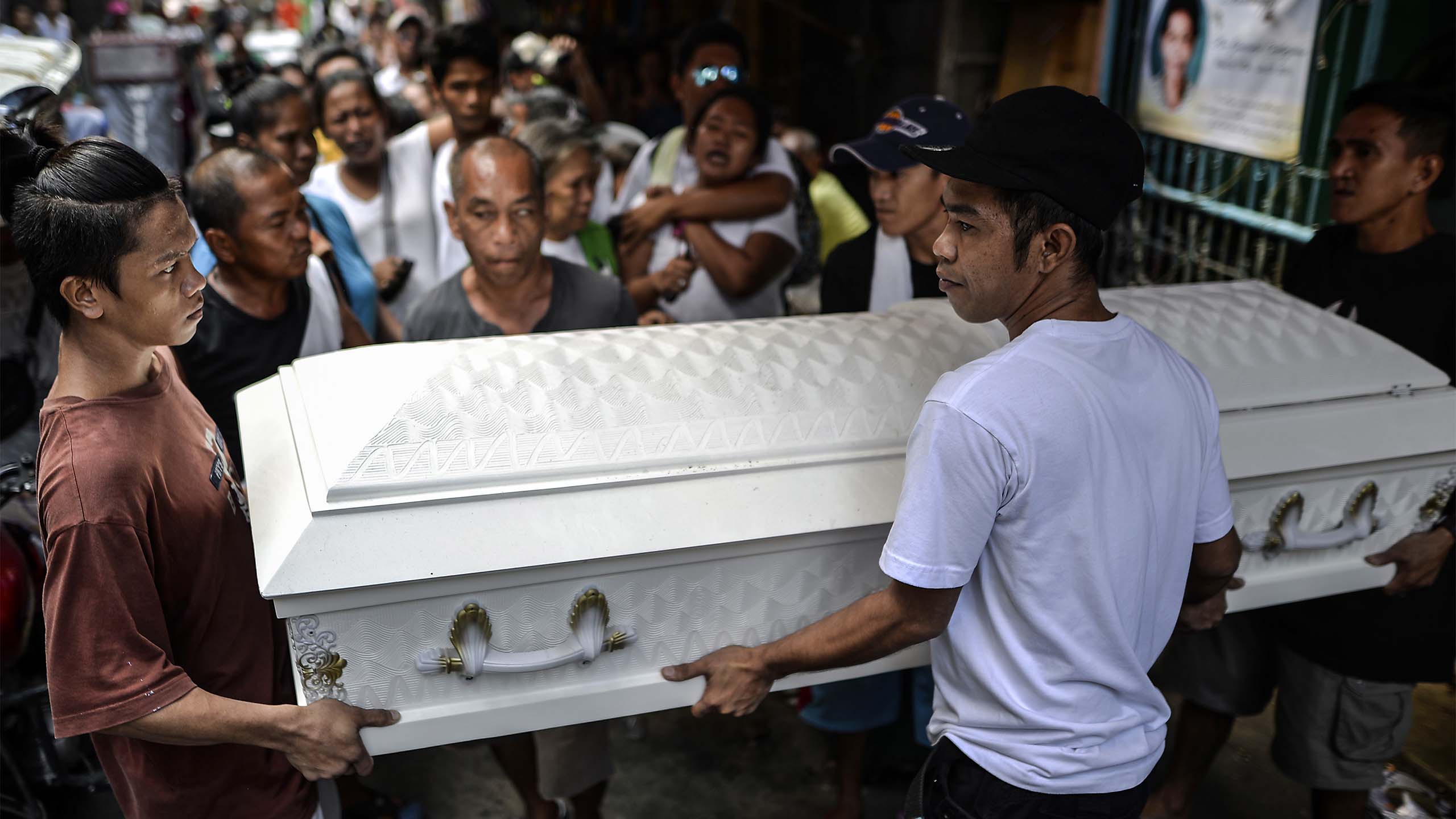 A photo from soon after Duterte’s war on drugs started in 2016 shows relatives carrying the coffin of a suspected drug pusher and victim of a vigilante-style execution, in Pasay, south of Manila. (Photo by Zeke Jacobs/Sipa via AP)