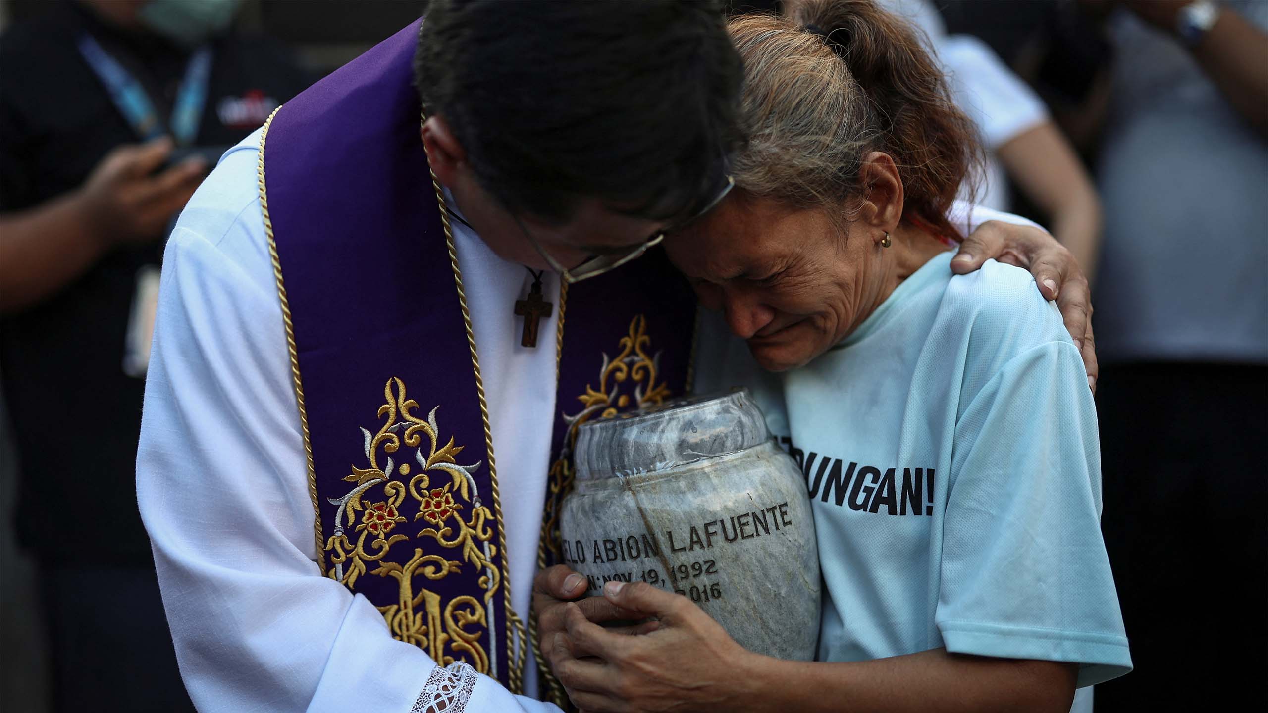Catholic priest Flavie Villanueva embraces Melinda Lafuente as she holds an urn containing the remains of her son Angelo, during an interment ceremony for victims of extrajudicial killings, at the Dambana ng Paghilom (Shrine of Healing) in Caloocan City, Metro Manila, on March 1. (Photo by Eloisa Lopez/Reuters)