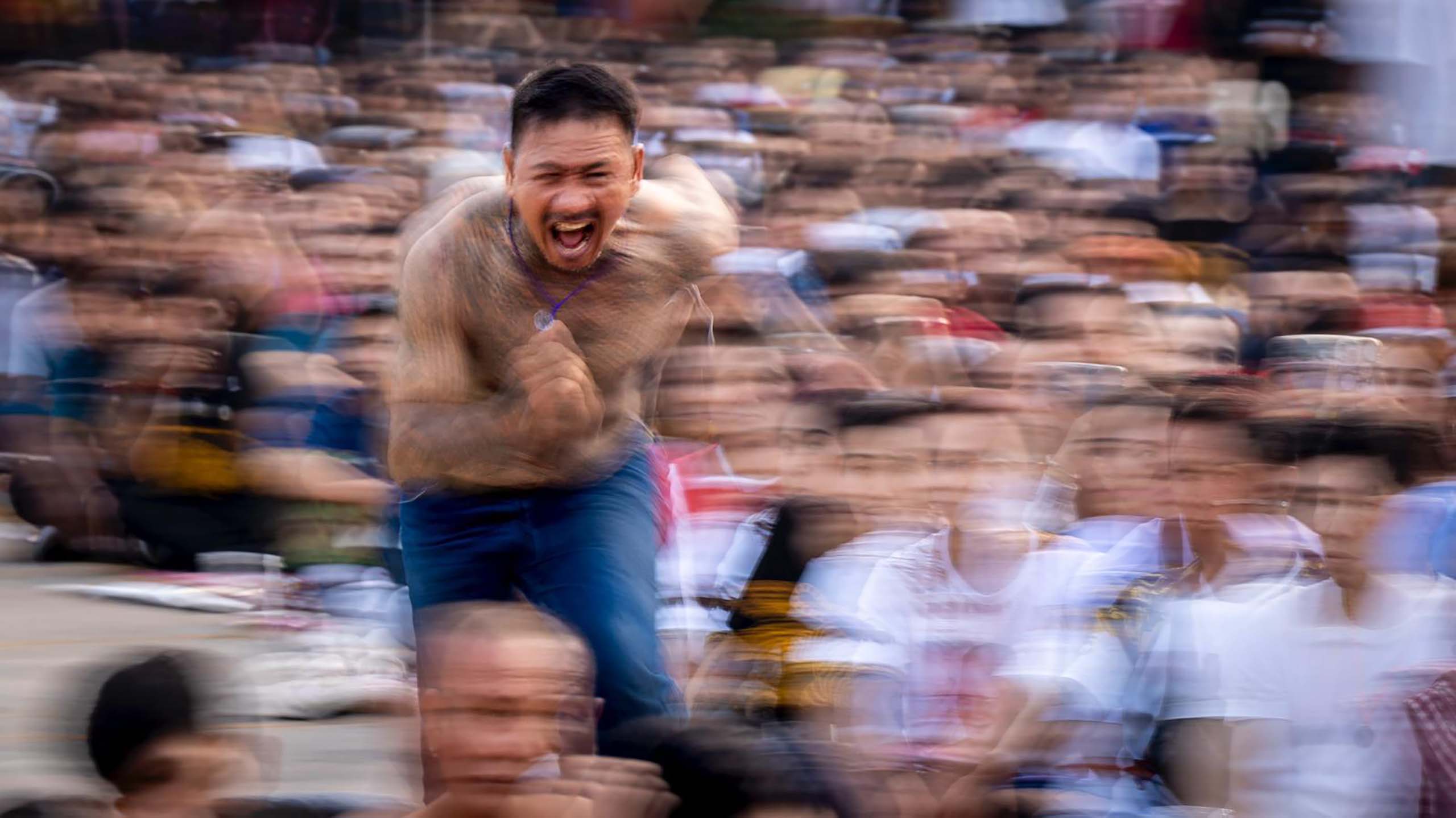 An entranced man shouts and runs toward the ceremonial altar of Wat Bang Phra Temple in Nakhon Pathom, Thailand, on March 8 during the annual Wai Kru ceremony. Wat Bang Phra Temple is known as an auspicious place to have Sak Yant tattoos made because of its association with the respected Thai Buddhist monk Luang Por Pern, who was known for his skill in making powerful tattoos, and is still revered today. (Photo by Adryel Talamantes)