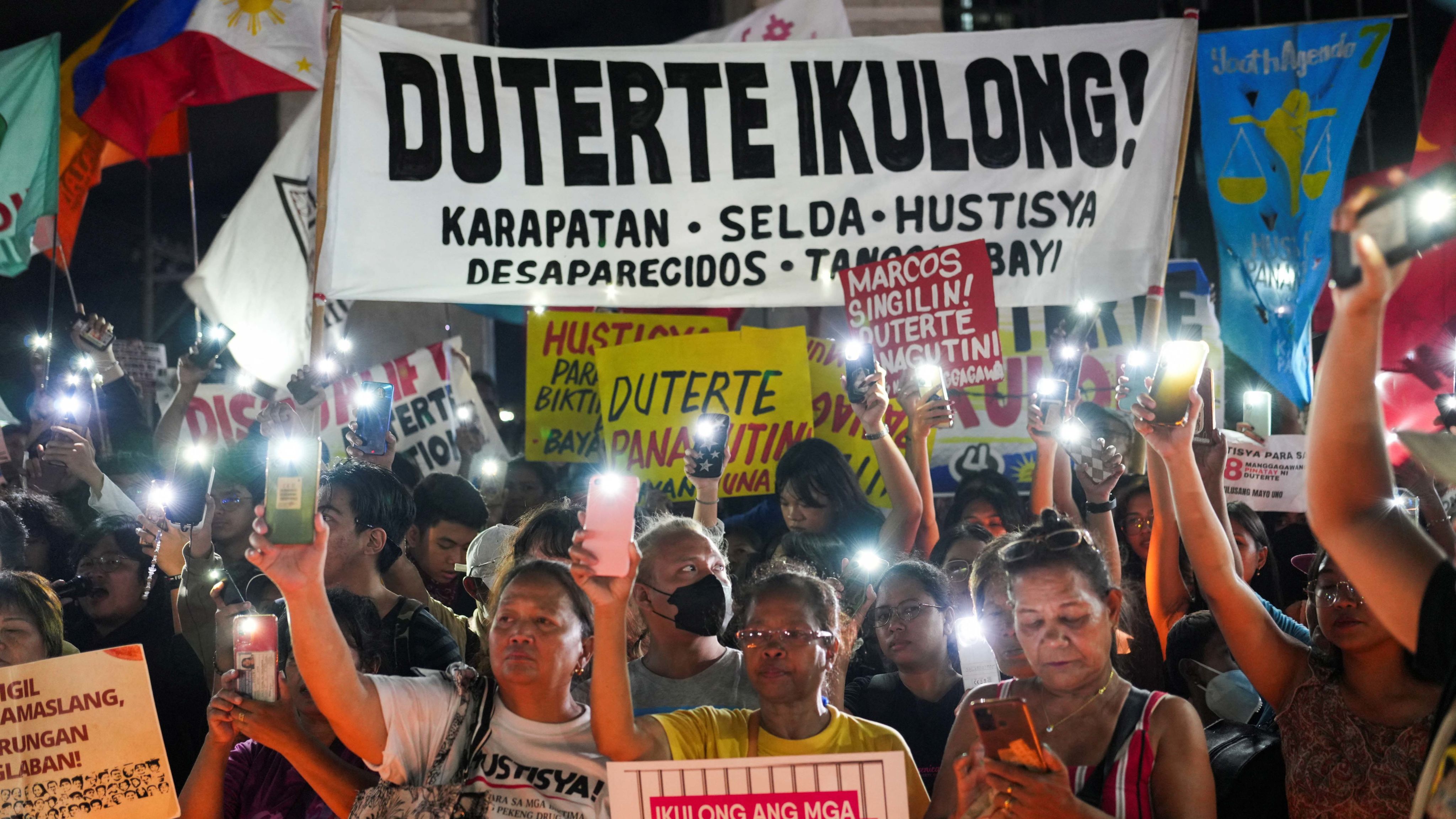 Filipino activists shine lights from their phones during a protest vigil supporting Duterte's arrest by the International Criminal Court, in Quezon City, Metro Manila, on March 11. (Photo by Fiel Ponferrada/Reuters)
