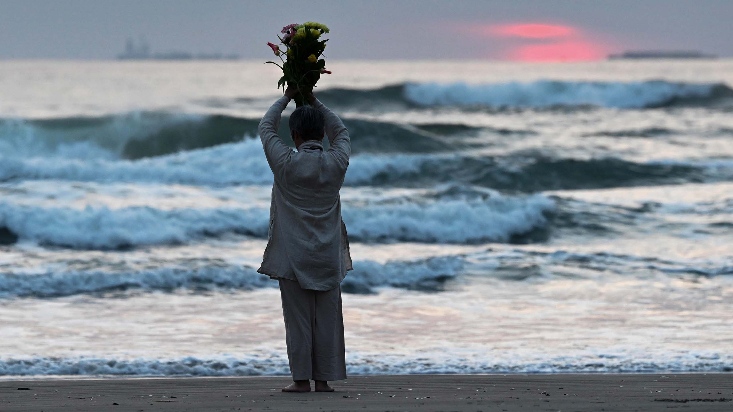 Mariko Odawara dedicates a dance to the victims of Japan’s 2011 earthquake and tsunami, at a beach in Fukushima prefecture on March 11, on the morning of the disaster’s 14th anniversary. More than 20,000 people died as a result of the disaster, while another 27,600 or so were displaced and scattered across Japan. (Photo by Sae Kamae)