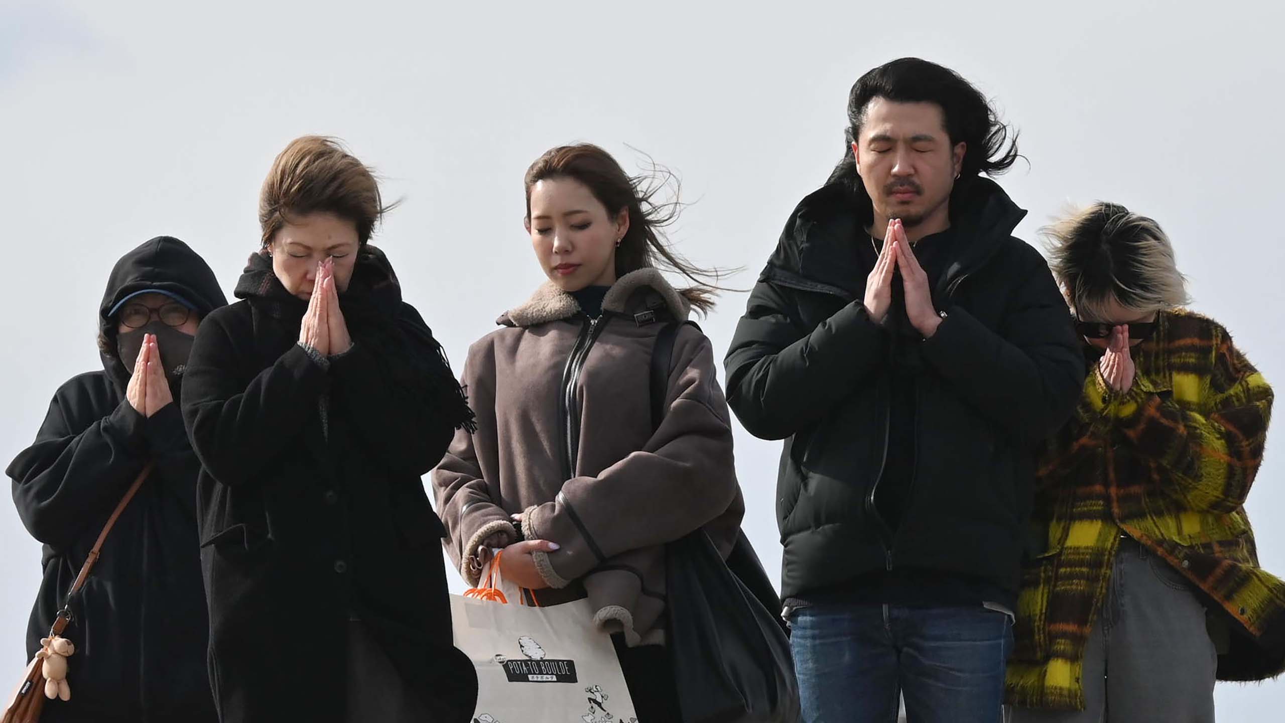 People observe a moment of silence as they face the sea in Fukushima prefecture, marking the minute the earthquake struck 14 years ago on March 11. (Photo by Sae Kamae)