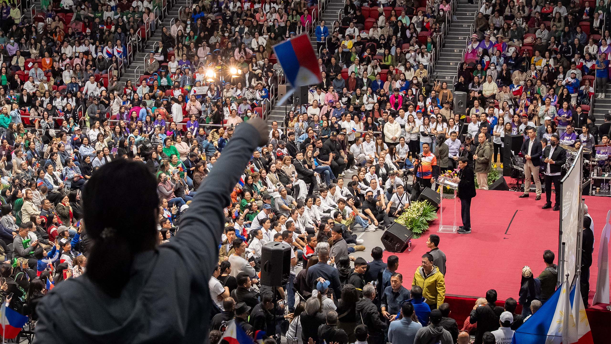 Thousands of overseas Filipino workers wave Philippine flags as Duterte gives a speech during a rally at Southorn Stadium in Hong Kong on March 9. (Photo by Anthony Kwan/Getty Images)