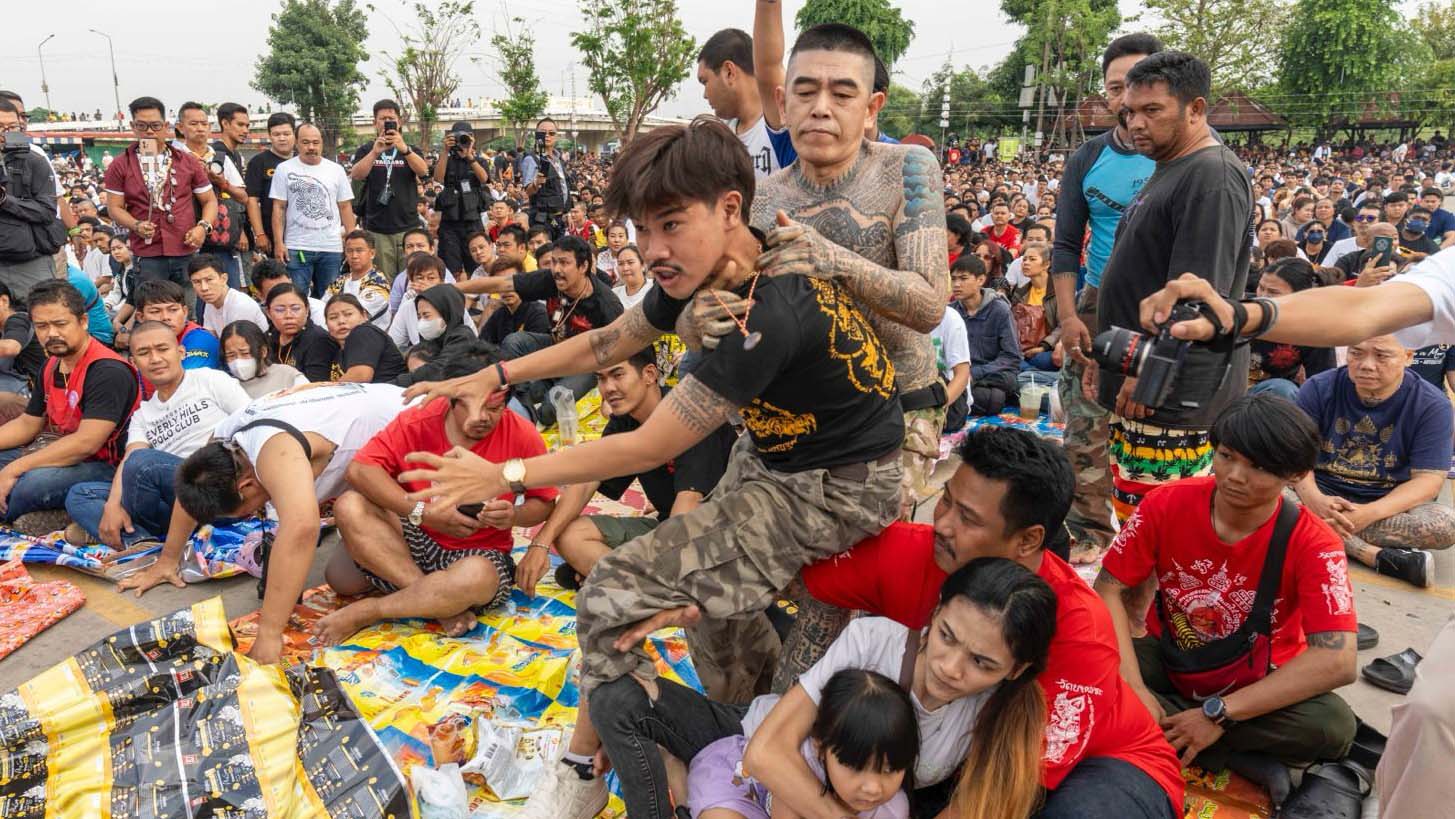 A man bearing full body Sak Yant tattoos restrains an entranced ceremony attendee. Sak Yant tattoos are believed to give their bearers supernatural protection from harm and bring good health, along with other benefits. Written out in archaic Thai and Khmer script as well as Pali-Sanskrit, Sak Yant tattoos culturally arose from the combination of Buddhism and regional belief. (Photo by Adryel Talamantes)