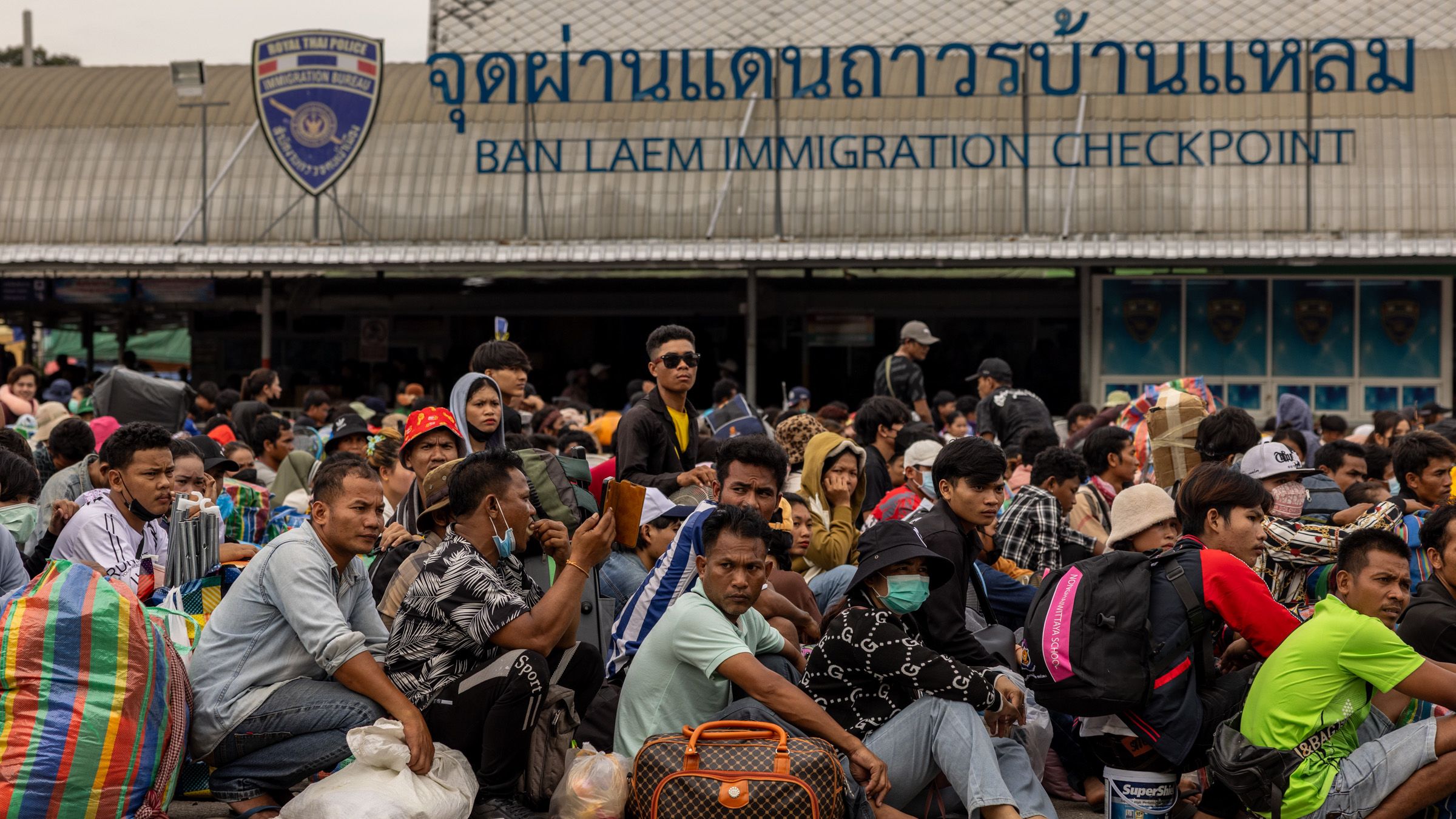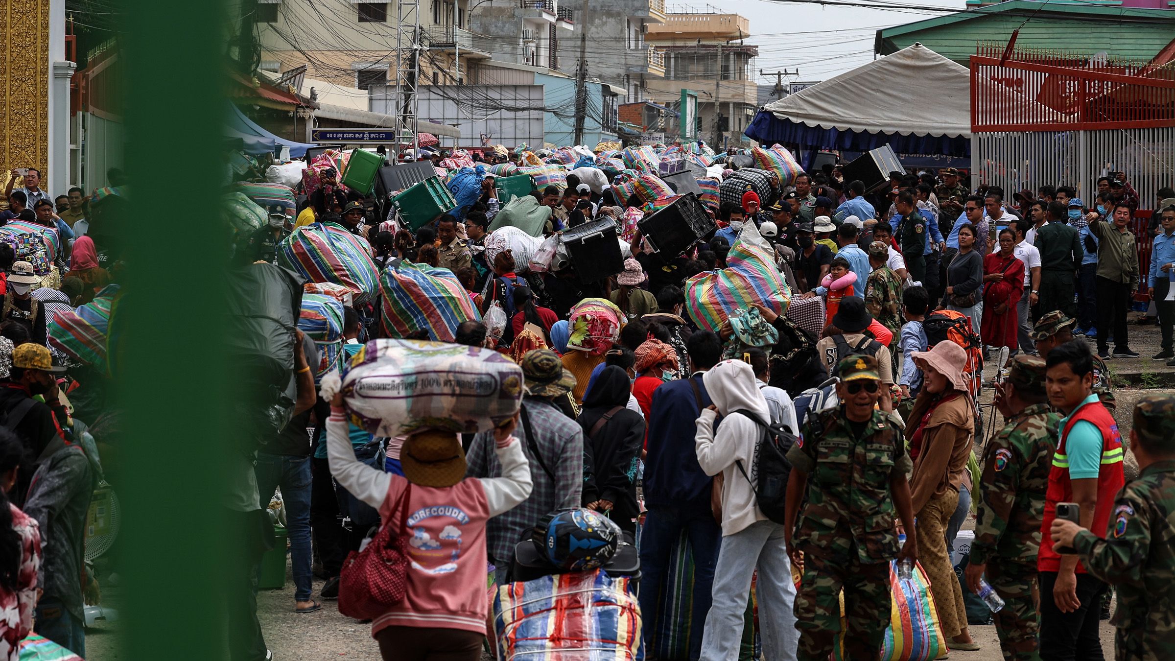 Cambodian migrant workers wait to cross the Ban Laem border checkpoint in Chanthaburi, Thailand, on July 28, as an estimated 20,000 Cambodian migrant workers were expected to cross back into Cambodia through the checkpoint that day, according to local officials. (Photo by Lauren DeCicca/Getty Images)