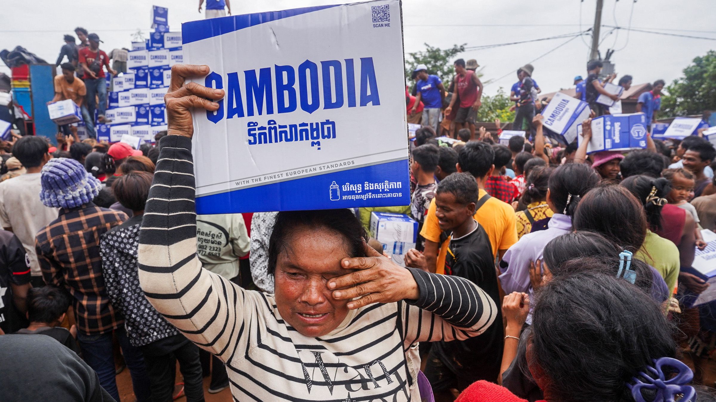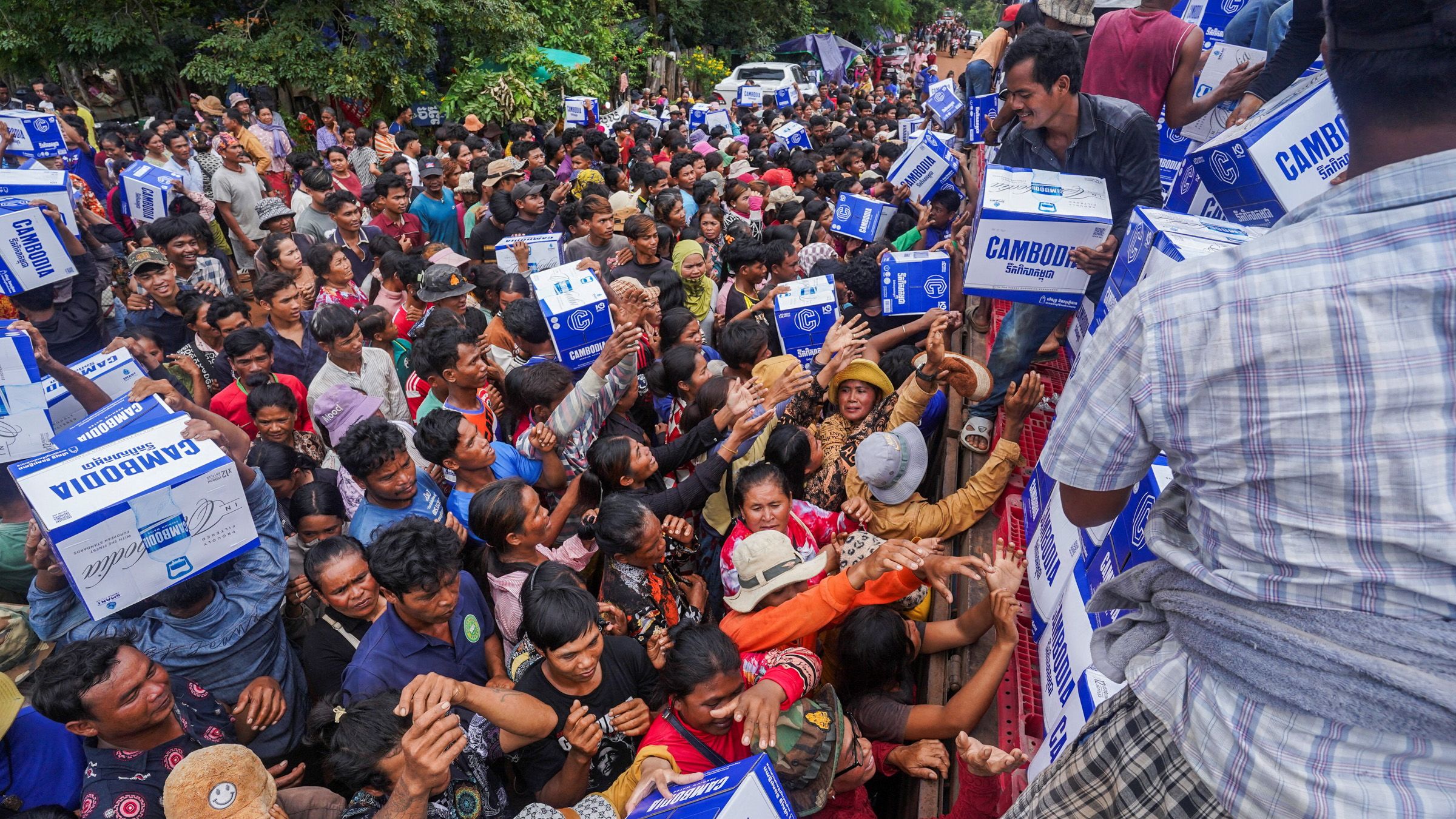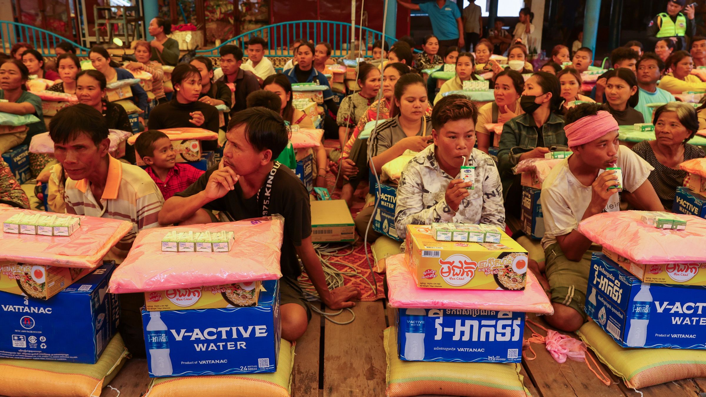 Cambodian refugees receive necessities while taking shelter at a temple in Krong Siem Reap, Cambodia, on July 27. (Photo by Daniel Ceng/Getty Images)