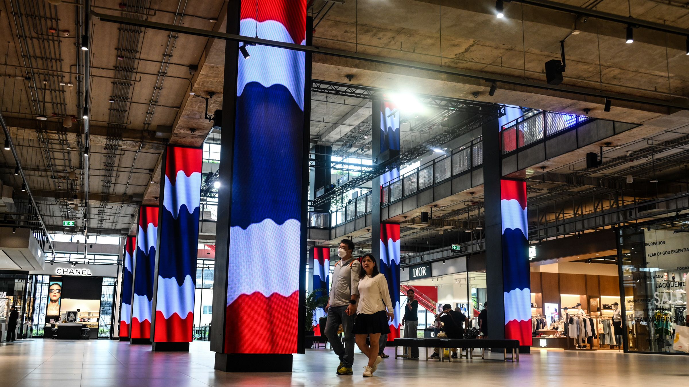 A mall in Bangkok, pictured on July 27. Many places in the Thai capital were decorated with the national flag during the conflict with Cambodia. (Photo by Suzu Takahashi)