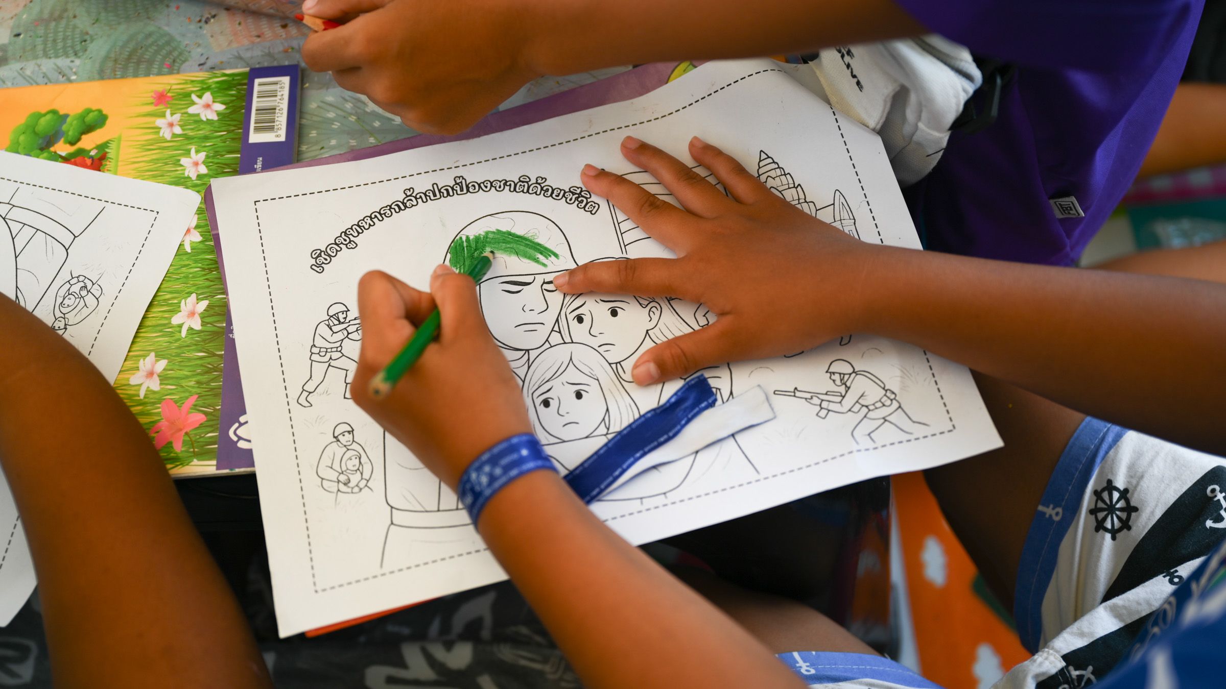 A child colors a donated propaganda image of a Thai soldier with the caption, "Honoring soldiers who risked their lives to defend their country," at the Chang International Circuit in Buriram, Thailand, on July 29. (Photo by Suzu Takahashi)