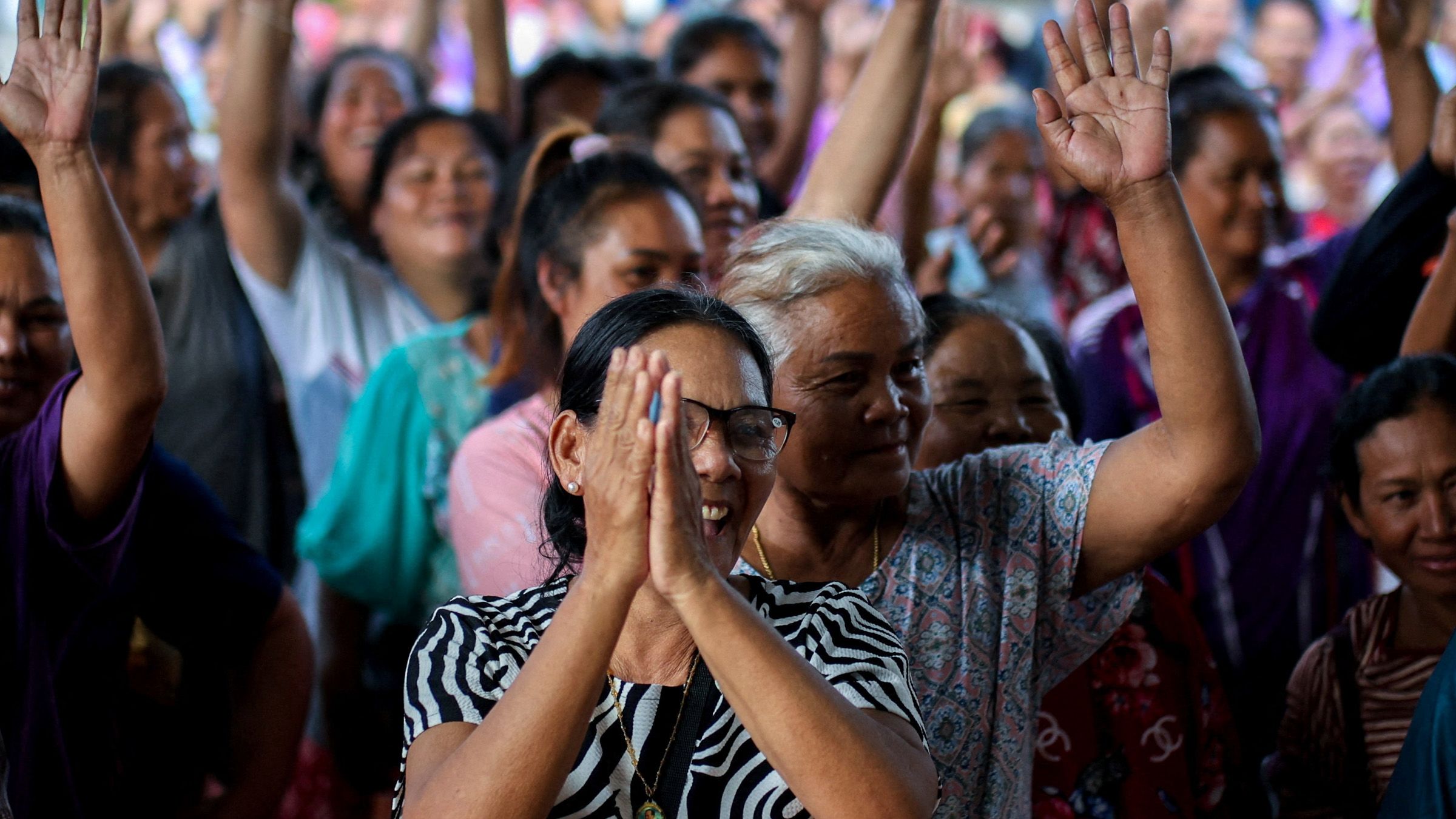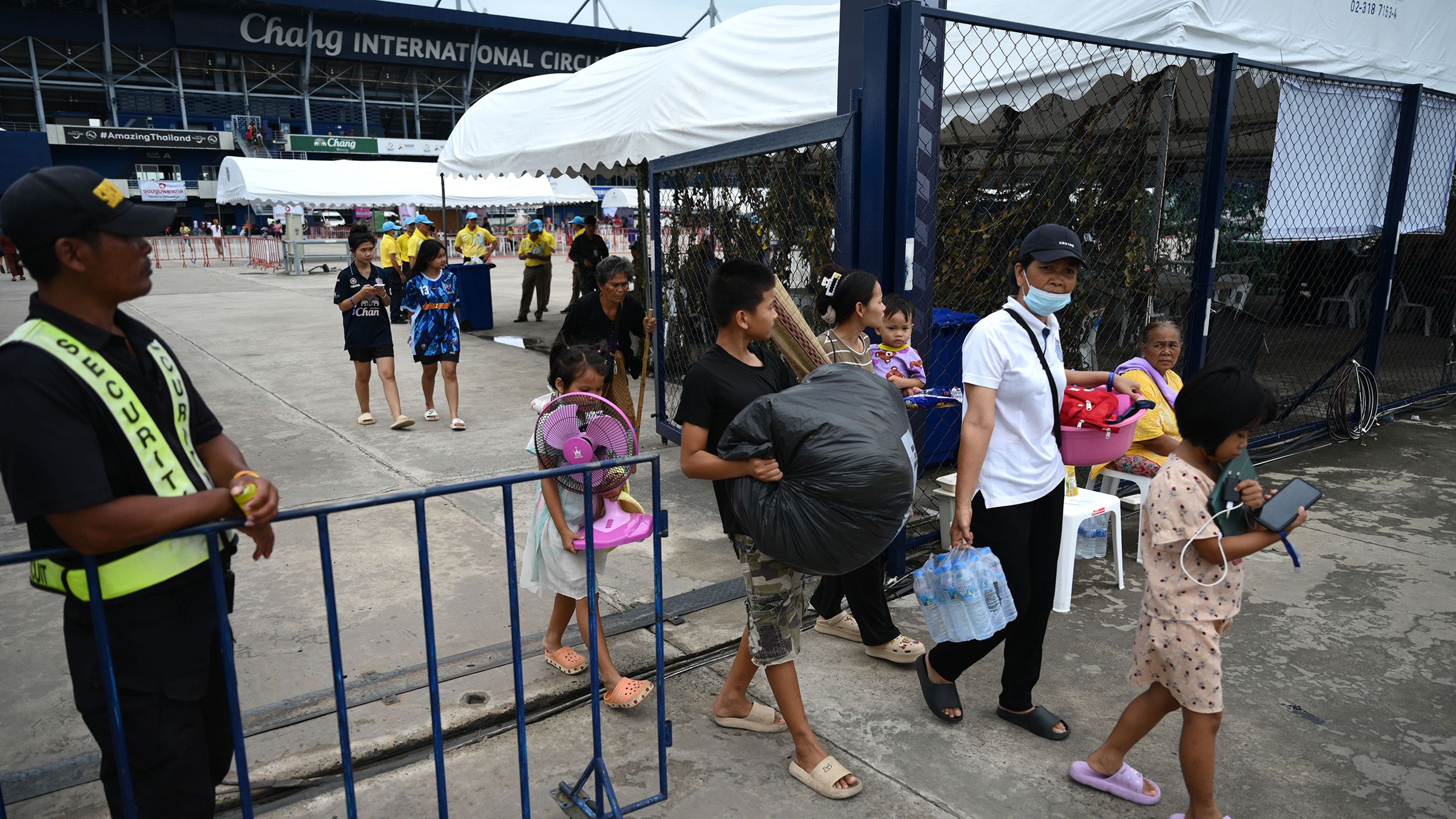 Displaced people react inside a temporary shelter in Sisaket province, Thailand, on July 28, after an announcement of a ceasefire. (Photo by Athit Perawongmetha/Reuters)