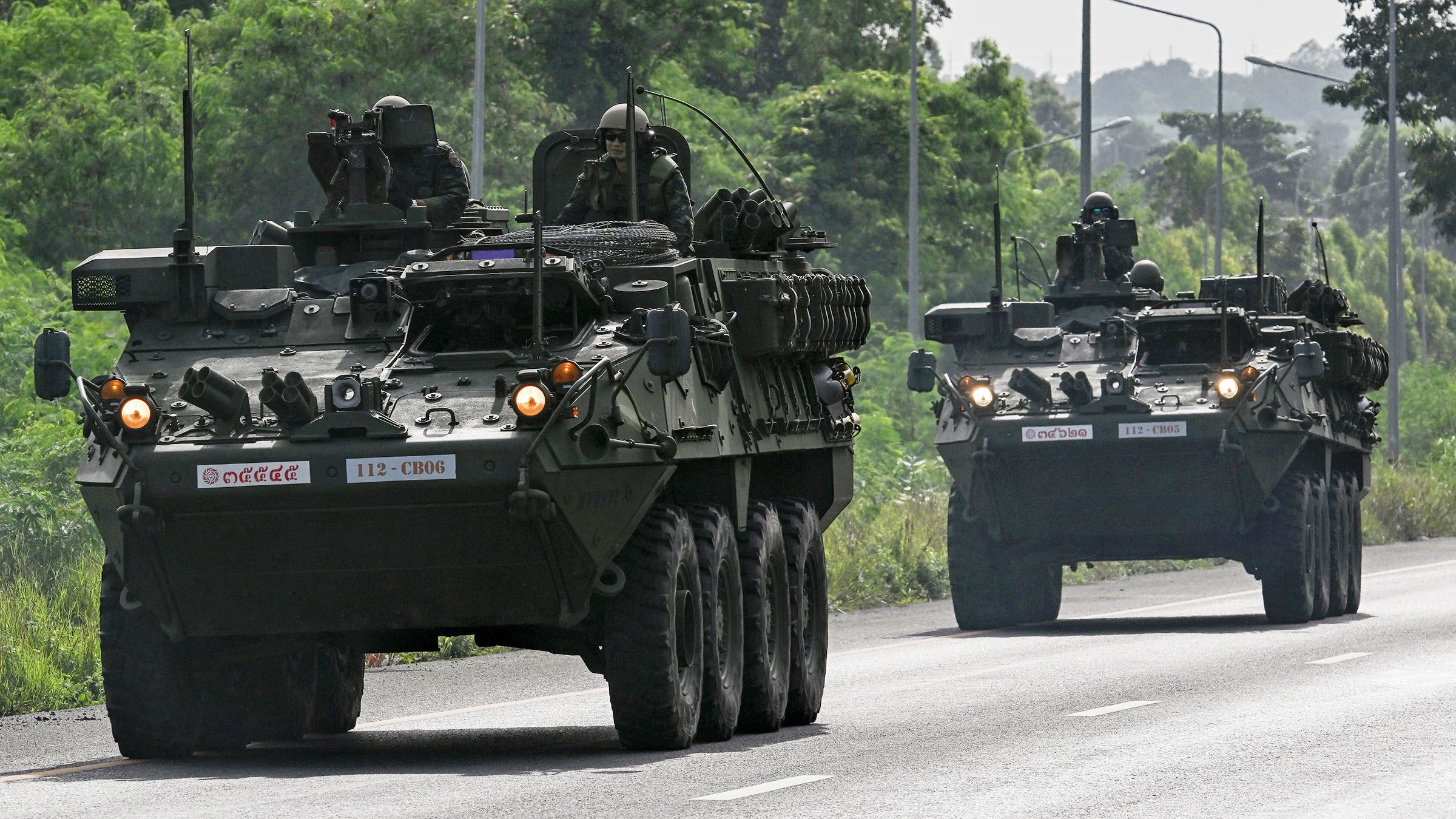 Royal Thai Army soldiers ride in armored vehicles in Chachoengsao province on July 24, the day Thailand launched airstrikes on Cambodian military targets and Cambodia fired rockets and artillery, with at least 11 civilians being killed in a dramatic escalation of a long-running border dispute between the two neighbors. (Photo by Lillian Suwanrumpha/AFP)
